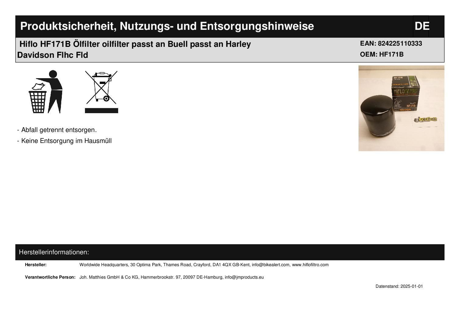 Hiflo HF171B Ölfilter oilfilter passt an Buell passt an Harley Davidson Flhc Fld
