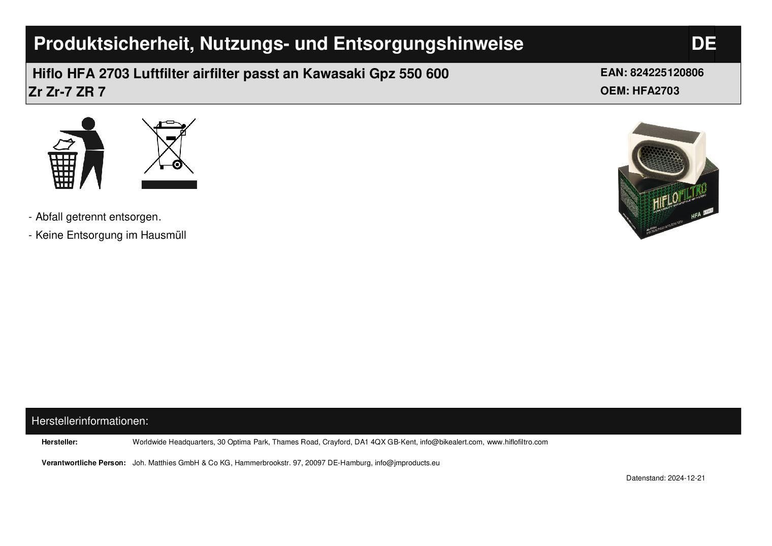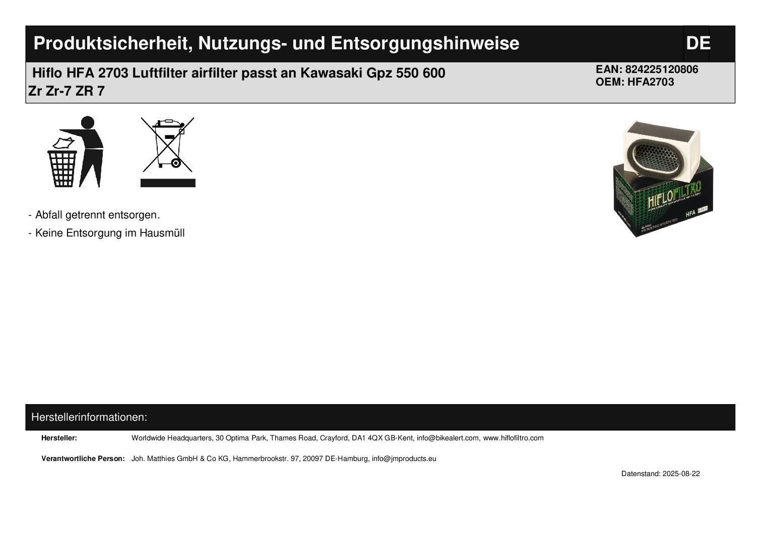 Hiflo HFA 2703 Luftfilter airfilter passt an Kawasaki Gpz 550 600 Zr Zr-7 ZR 7