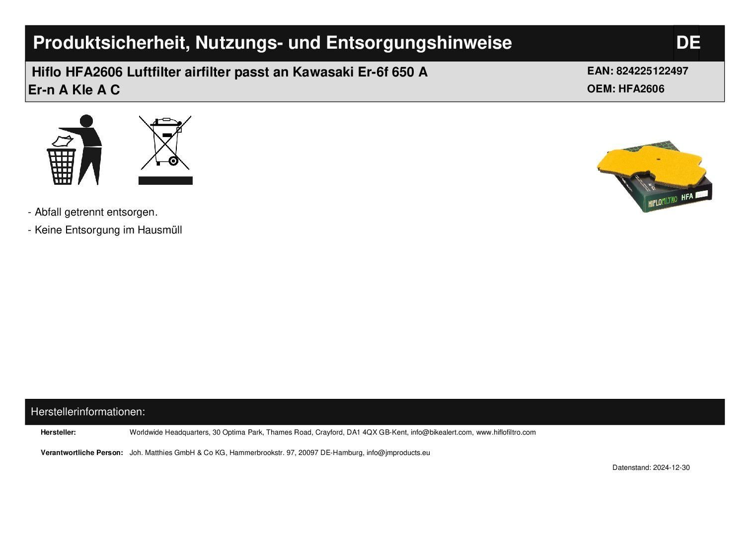 Hiflo HFA2606 Luftfilter airfilter passt an Kawasaki Er-6f 650 A Er-n A Kle A C