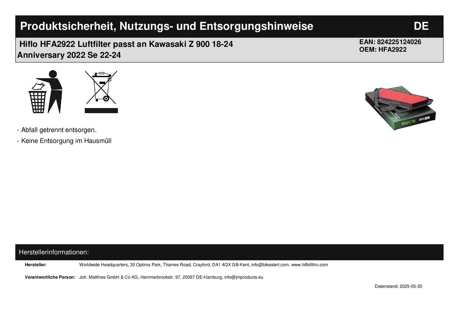 Hiflo HFA2922 Luftfilter passt an Kawasaki Z 900 18-24 Anniversary 2022 Se 22-24
