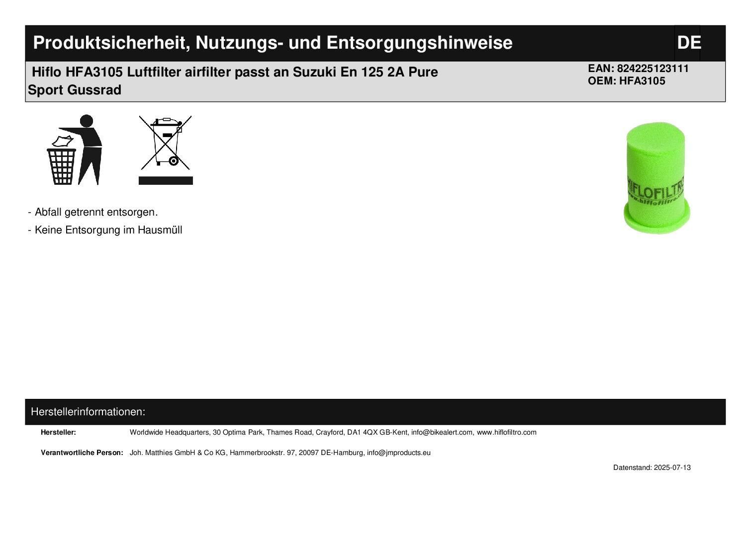 Hiflo HFA3105 Luftfilter airfilter passt an Suzuki En 125 2A Pure Sport Gussrad