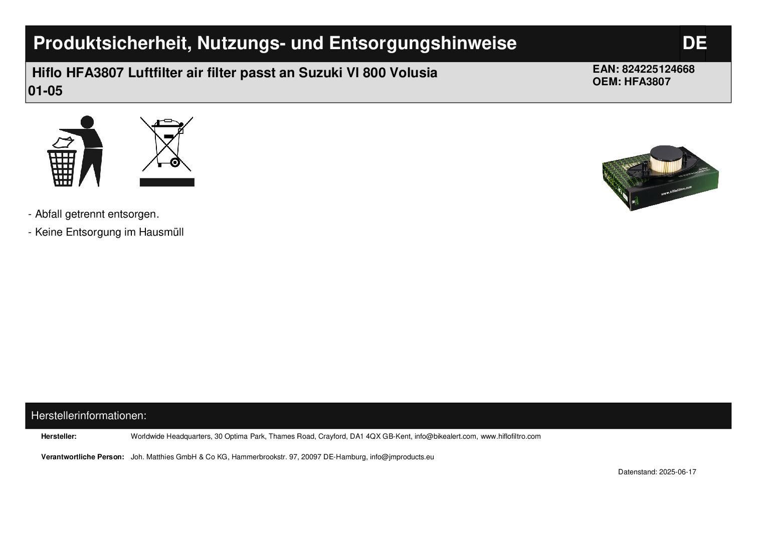 Hiflo HFA3807 Luftfilter air filter passt an Suzuki Vl 800 Volusia 01-05