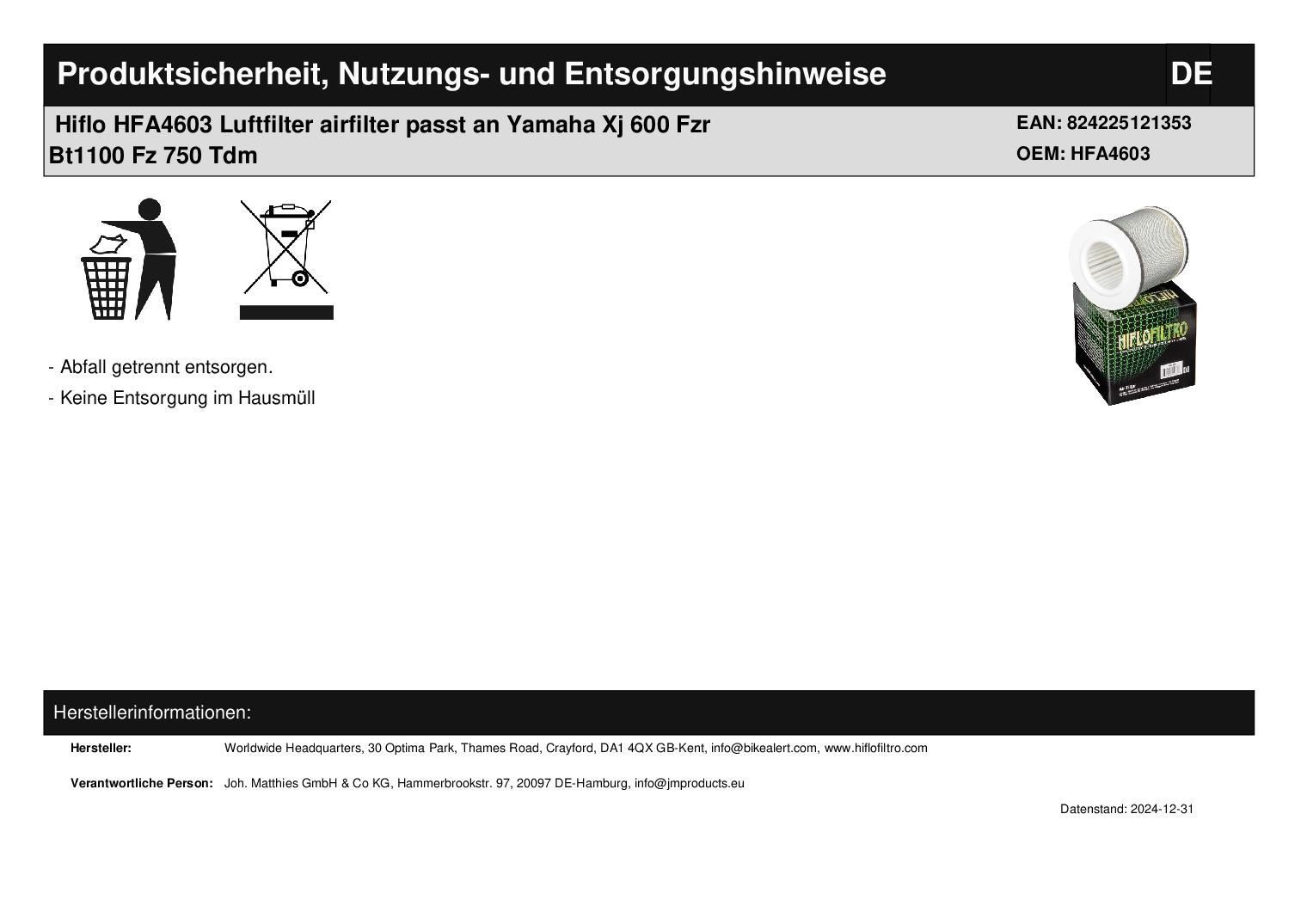 Hiflo HFA4603 Luftfilter airfilter passt an Yamaha Xj 600 Fzr Bt1100 Fz 750 Tdm