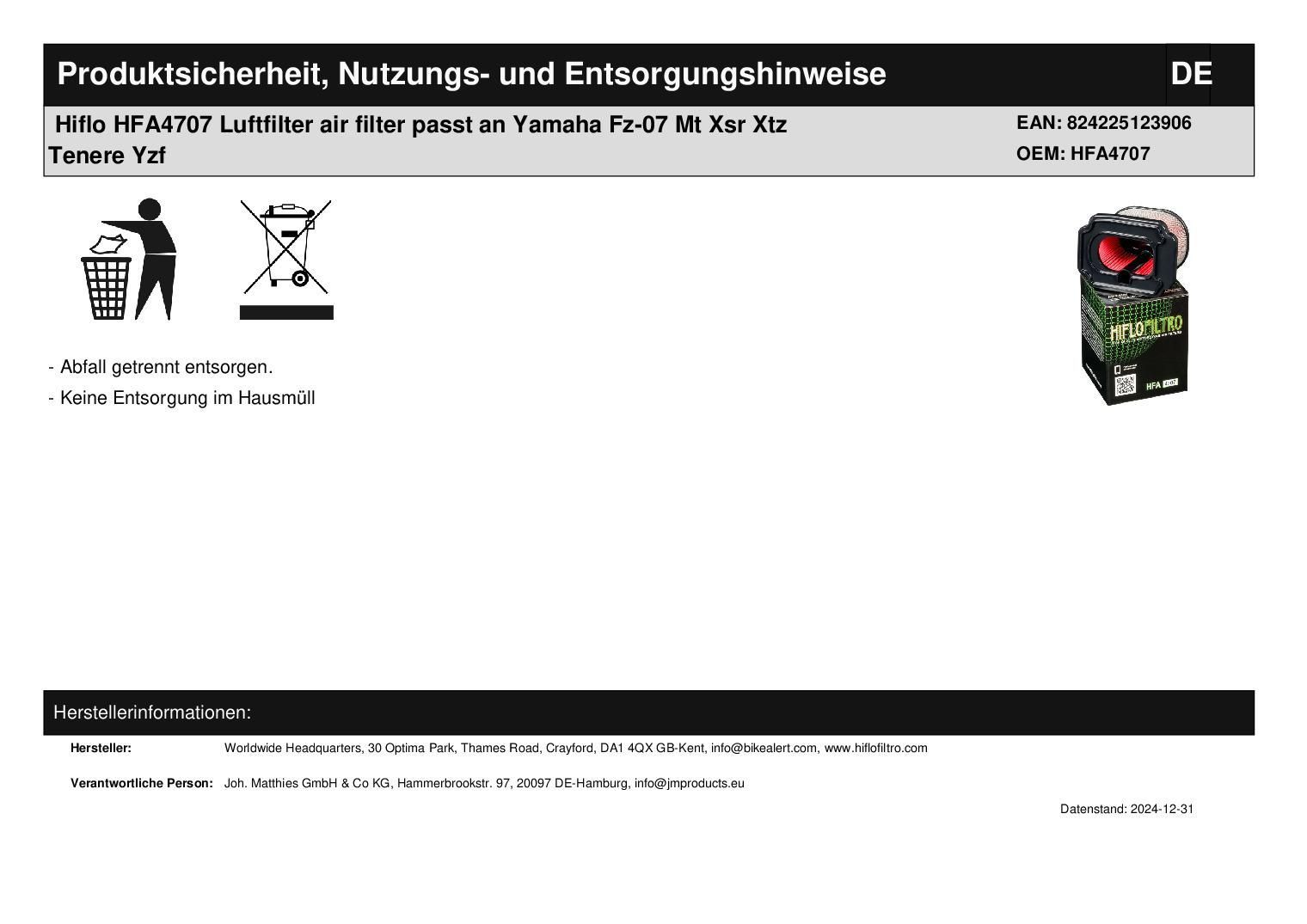 Hiflo HFA4707 Luftfilter air filter passt an Yamaha Fz-07 Mt Xsr Xtz Tenere Yzf