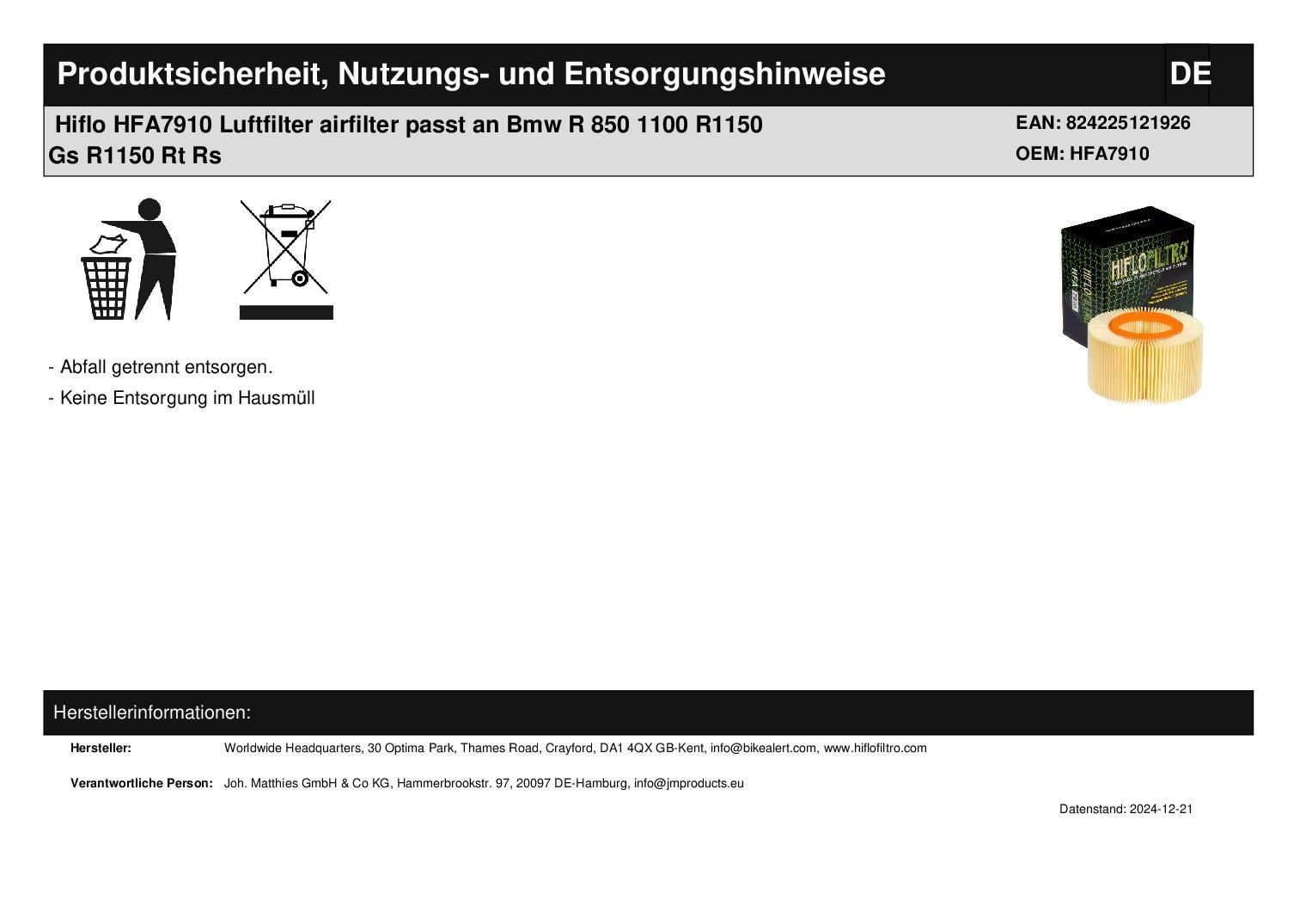 Hiflo HFA7910 Luftfilter airfilter passt an Bmw R 850 1100 R1150 Gs R1150 Rt Rs
