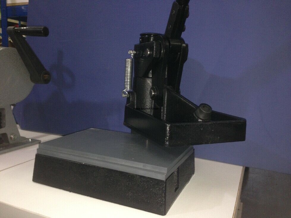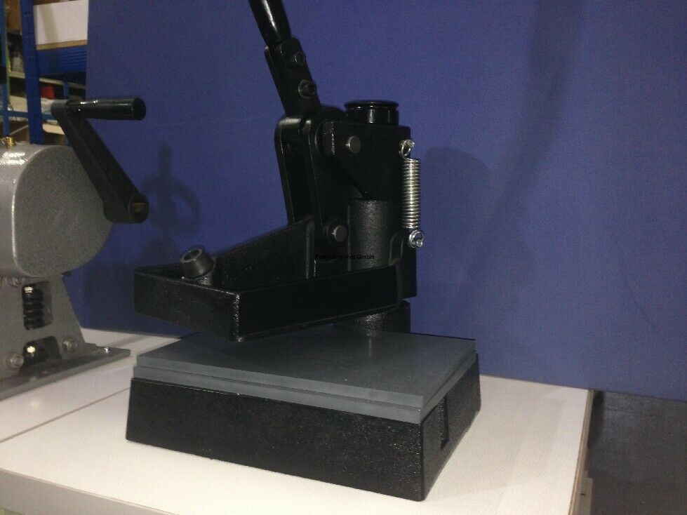 Hightex Cowboy 8360 einfache manuelle Handstanze. Die Höhe der Druckplatte ist einstellbar und schwenkbar. Die Schwenkarmstanze ist mit einer Druckkraft von ca 5 Tonnen angegeben. Die Schneidunterlage ist mit dabei. Technische Daten Specifications: Stanzdruck max. Cutting pressure - up to 5 tons Bre