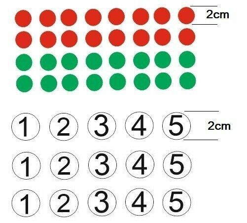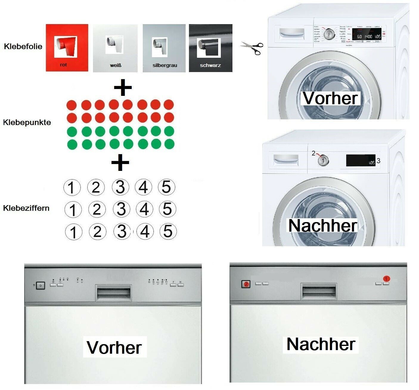 Aufkleber Set zur erleichterten Bedienung von Haushaltsgeräten Ein Set bestehend aus 4 Folienbögen, rot, silber, schwarz und weiß (je Bogen in A5 Größe) 3x Zahlenaufkleber von 1-5 (schwarze Zahlen auf Transparenten Hintergrund) 16 Stk rote Klebepunkte 16 Stück grüne Klebepunkte Schneiden Sie mit Hil
