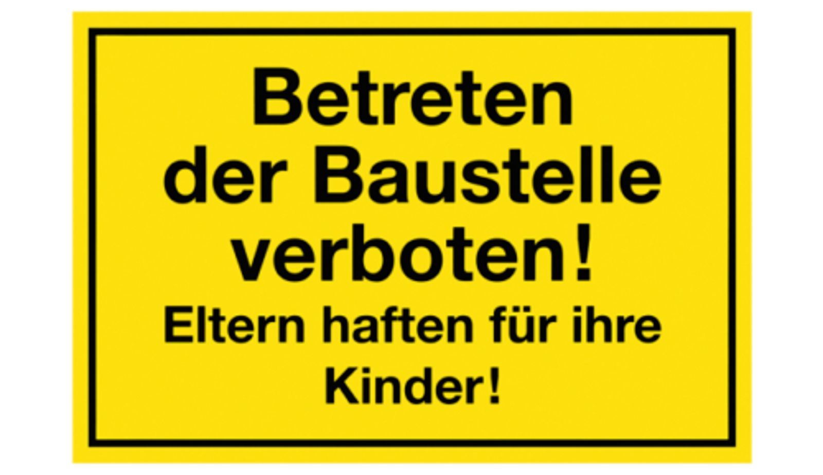 Hinweisschild Betreten der Baustelle verboten! Eltern haften für Ihre Kinder! 150 x 250 mm Kunststoff NEU KOSTENLOSER VERSAND !!! Artikelbeschreibung: - Hinweisschild Betreten der Baustelle verboten! Eltern haften für Ihre Kinder! - Kunststoff - 150 mm x 250 mm - gelb schwarz KOSTENLOSER VERSAND !!!