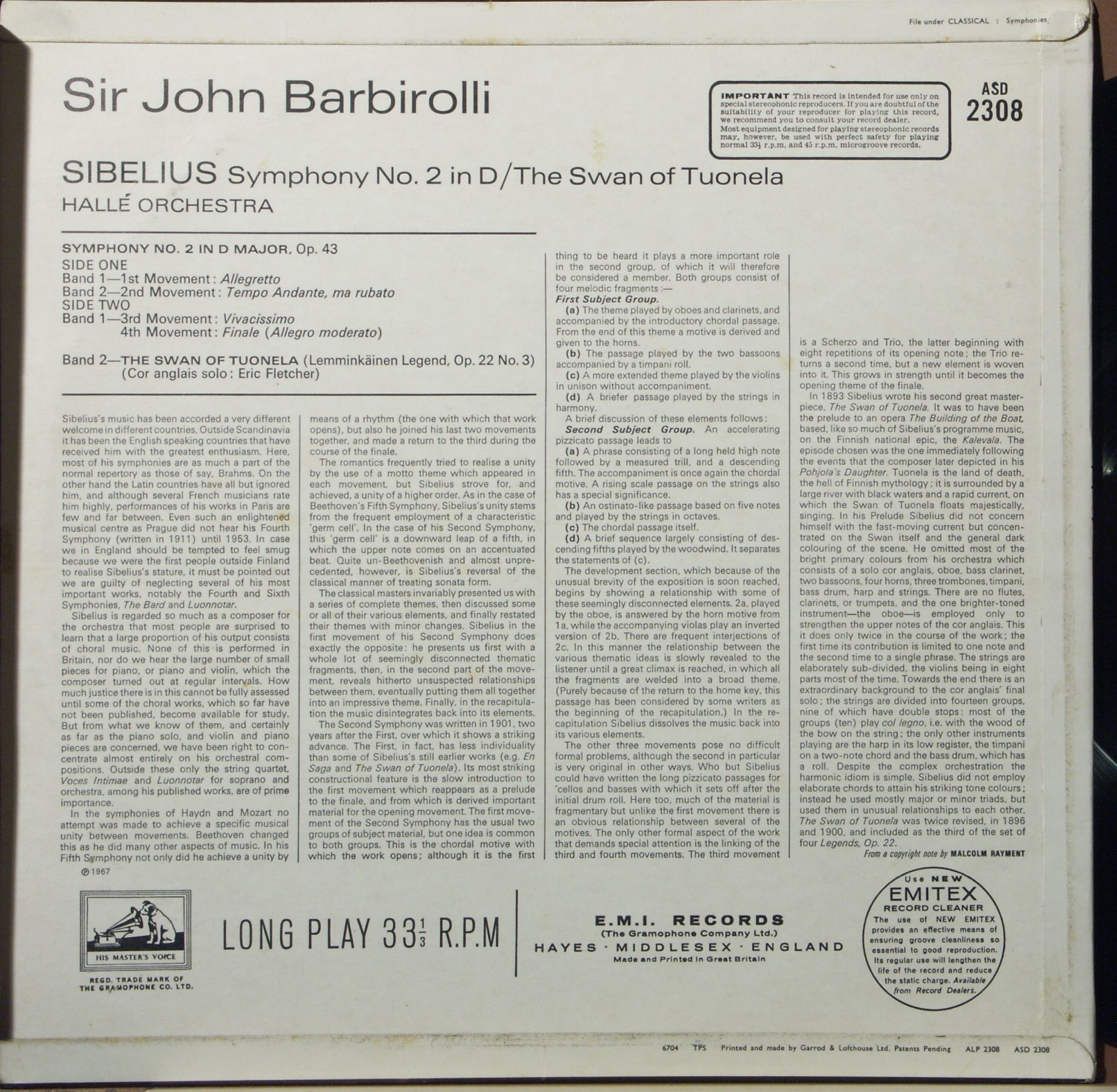 His Master's Voice ASD 2308 - Jean Sibelius, Sir John Barbirolli, Hallé Orchest