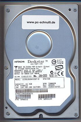 Hitachi Deskstar - 61 GB Hersteller: Hitachi Modell: Deskstar IC35L060AVV207-0 RPM: 7200 Formatiert: 61,4 GB Dateisystem: NTFS Partition: Eine Anschluß: 40 pin. IDE (UDMA 100) Funktionstest: OK, frisch formatiert Geprüft mit Seatools 2.20 Baujahr: 2003 Sonstiges: - Lieferumfang: Festplatte Festplatt