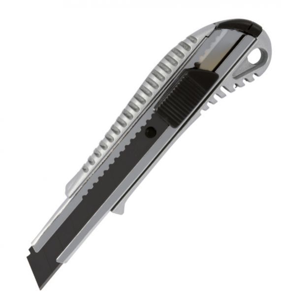 Aus Metall, schlanke Ausführung Mit schwarzer Abbrechklinge, Breite 18 mm Gummikomponente im Griffbereich für sicheres Arbeiten Metallführung der Klinge mit Feststellschieber Feinverzahnter Vorschubmechanismus Passende Abbrechklingen AB2, B101, B105