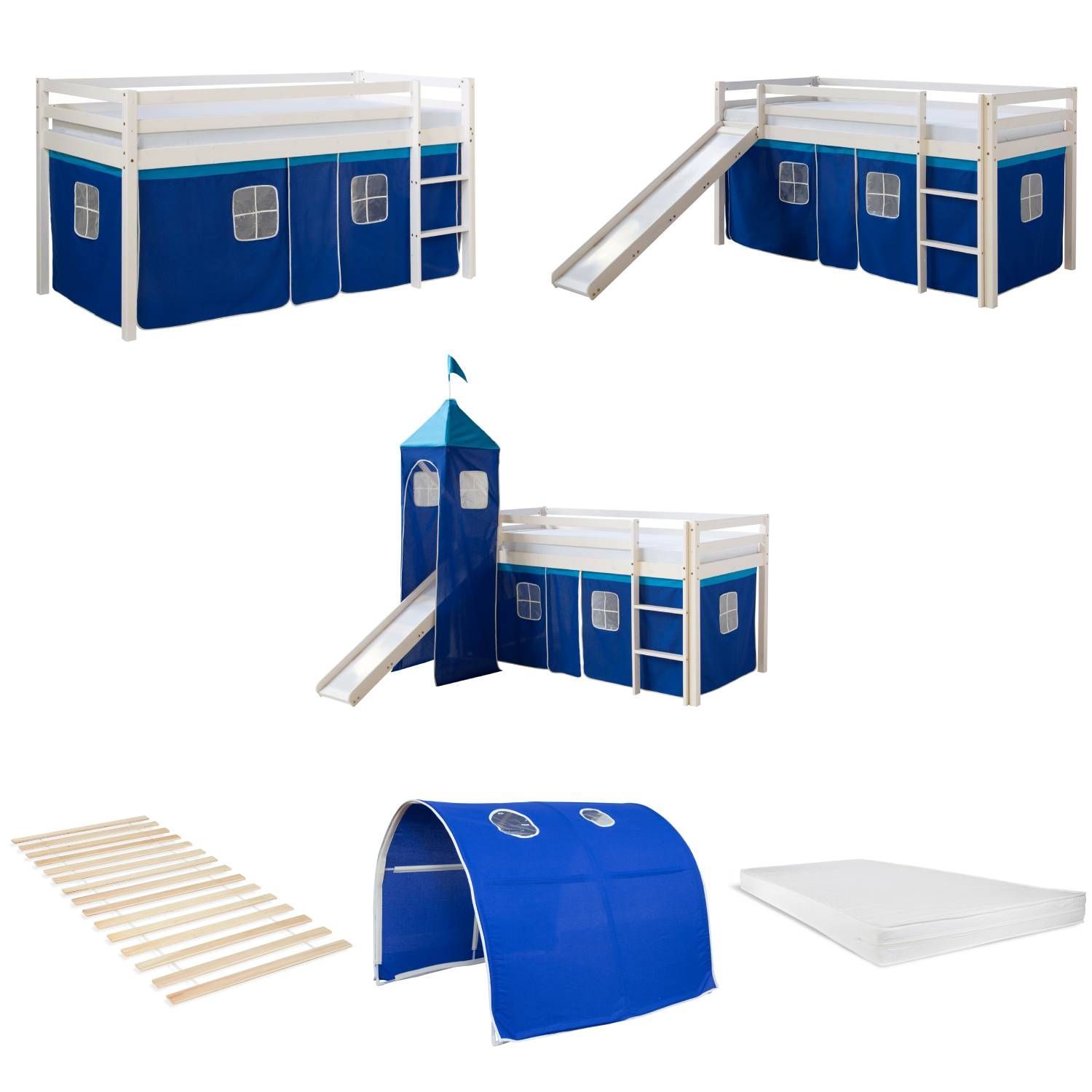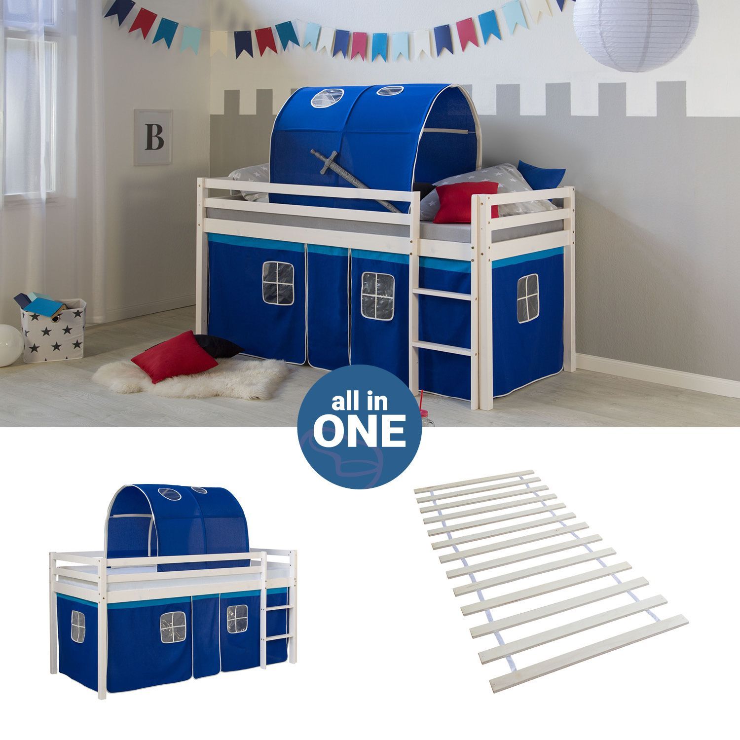 Hochbett 90x200 cm Stockbett Kinderbett Holz Kiefer Vorhang Turm Tunnel blau Rutsc