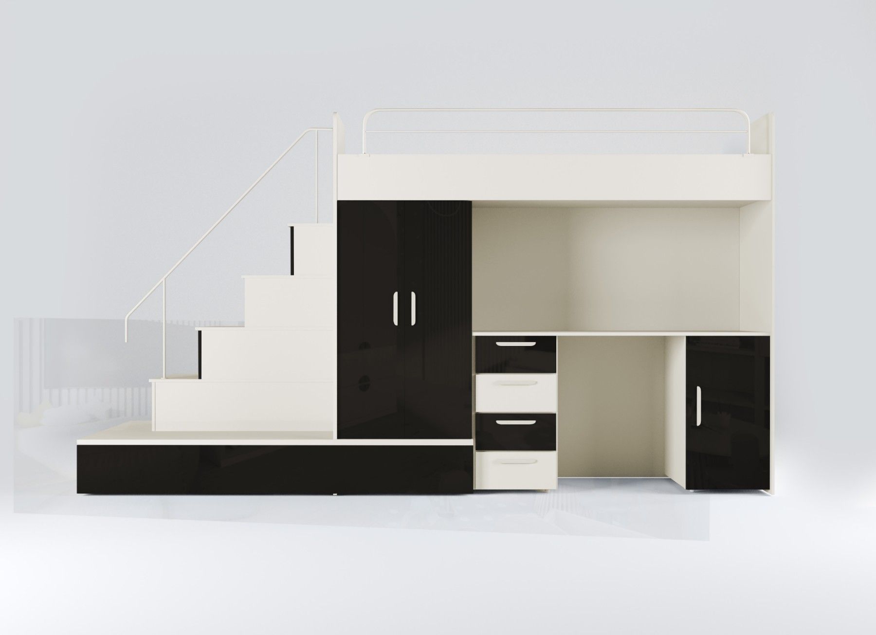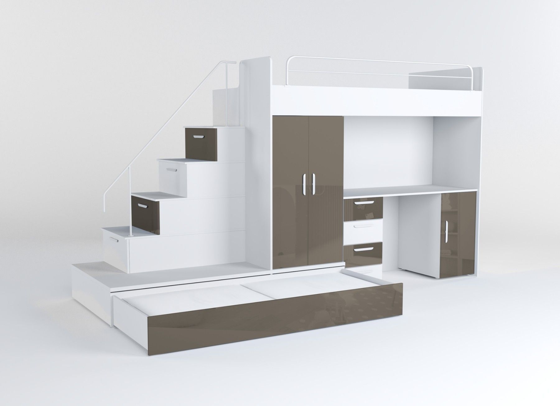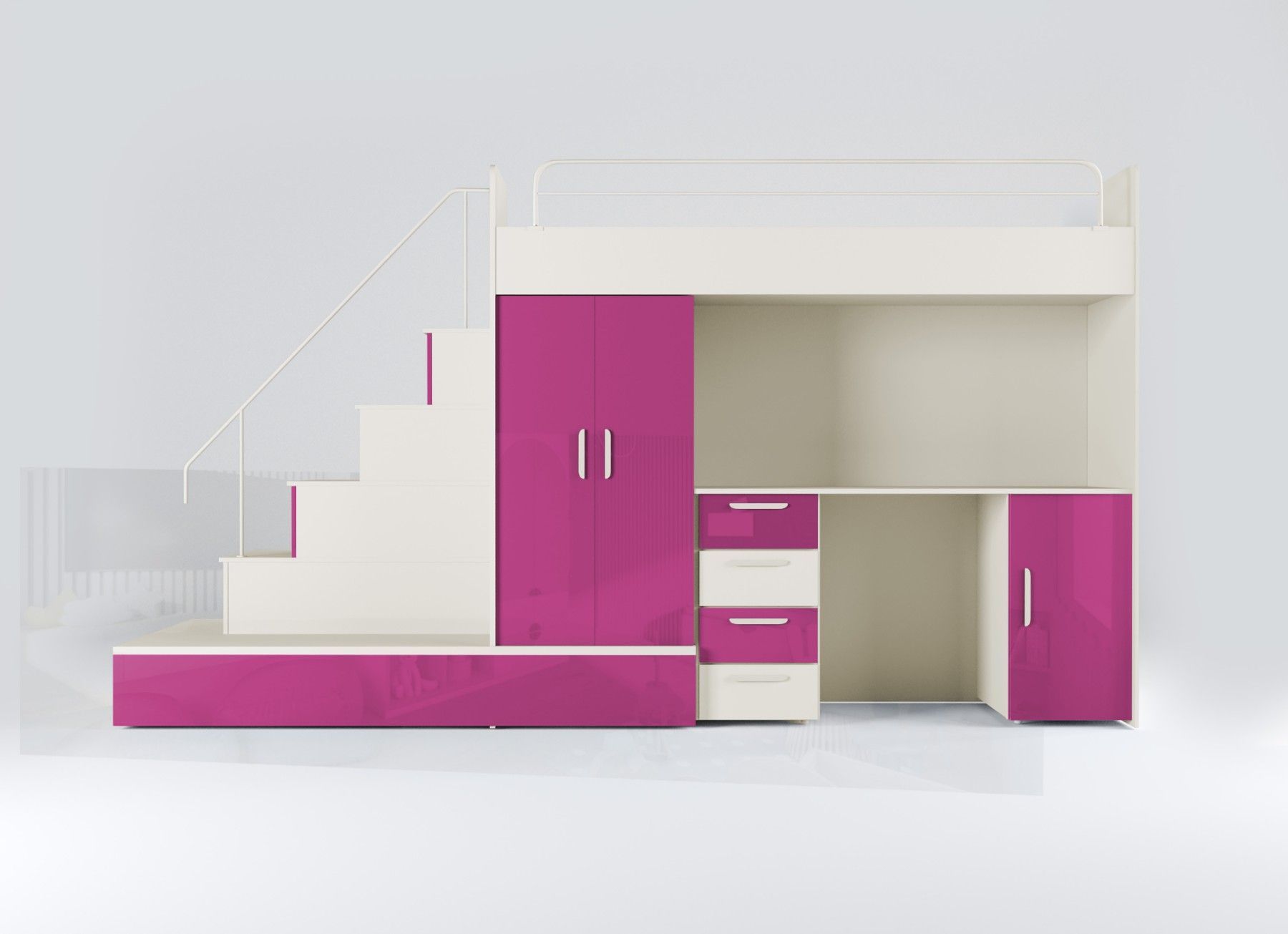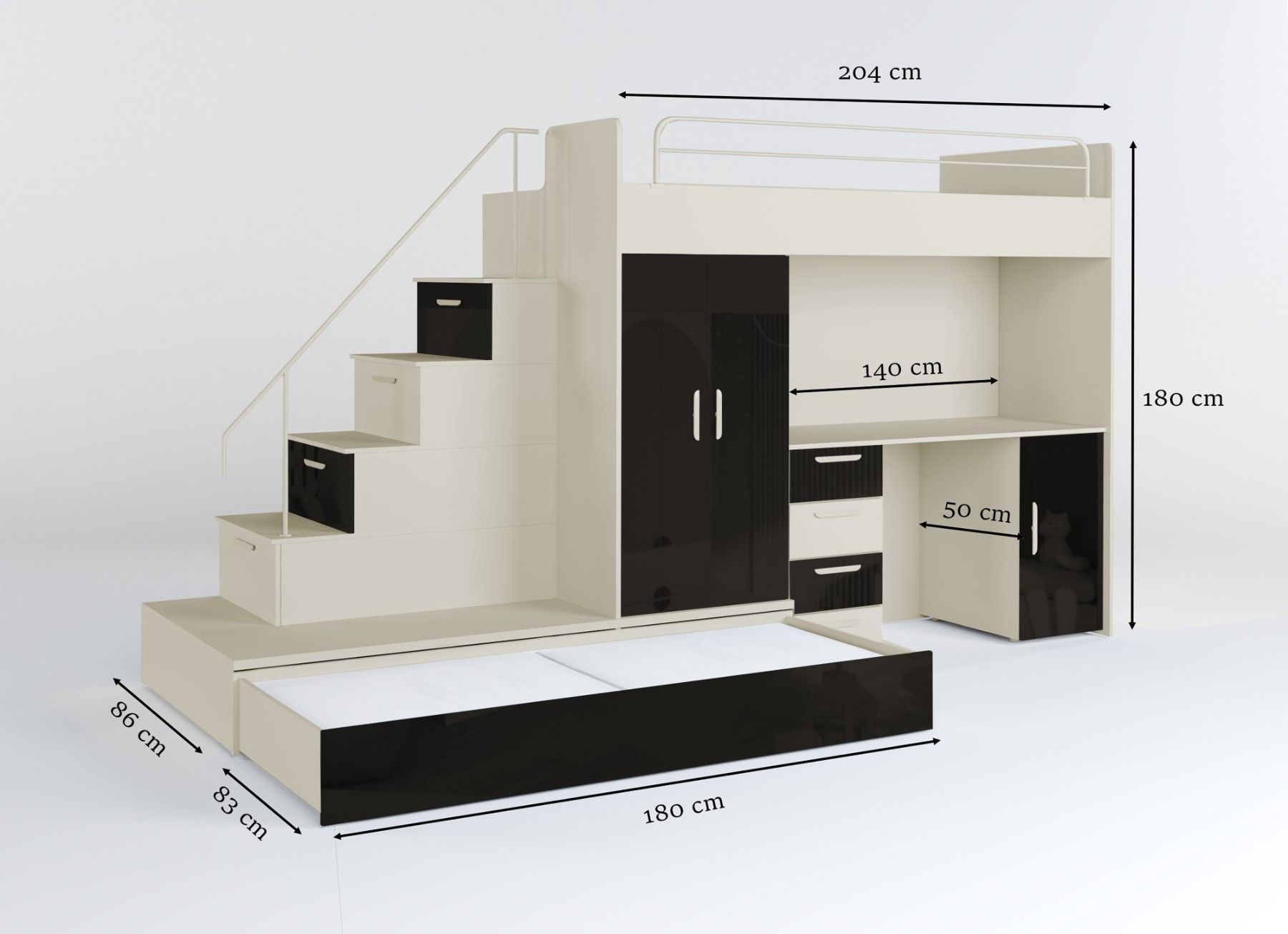 Hochbett mit Schreibtisch - TOMI 5 Möbel aus 16 mm dicker Laminatplatte mit erhöhter Kratzfestigkeit Räucher mit PVC-Furnier Acrylfolie-beschichtetes Set für Glanzeffekt Möbelkörper - matt Das Set besteht aus bettkörper, Schaumstoffmatratze in der unteren ausziehbaren Schublade, Schrank, Treppe zum