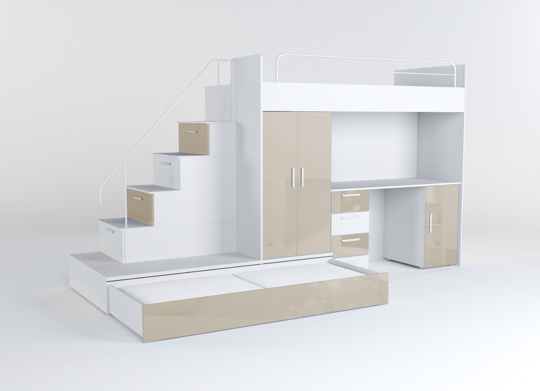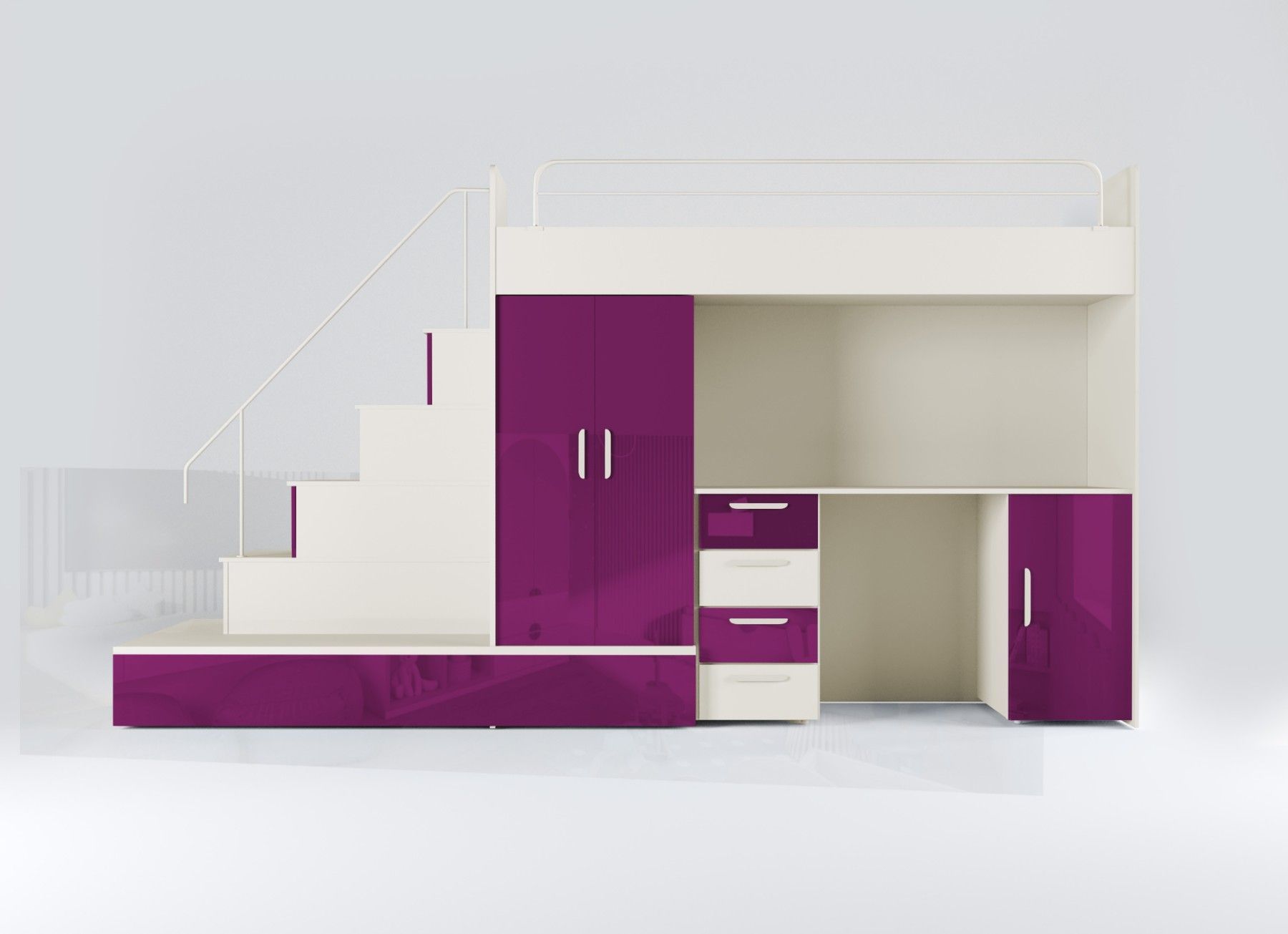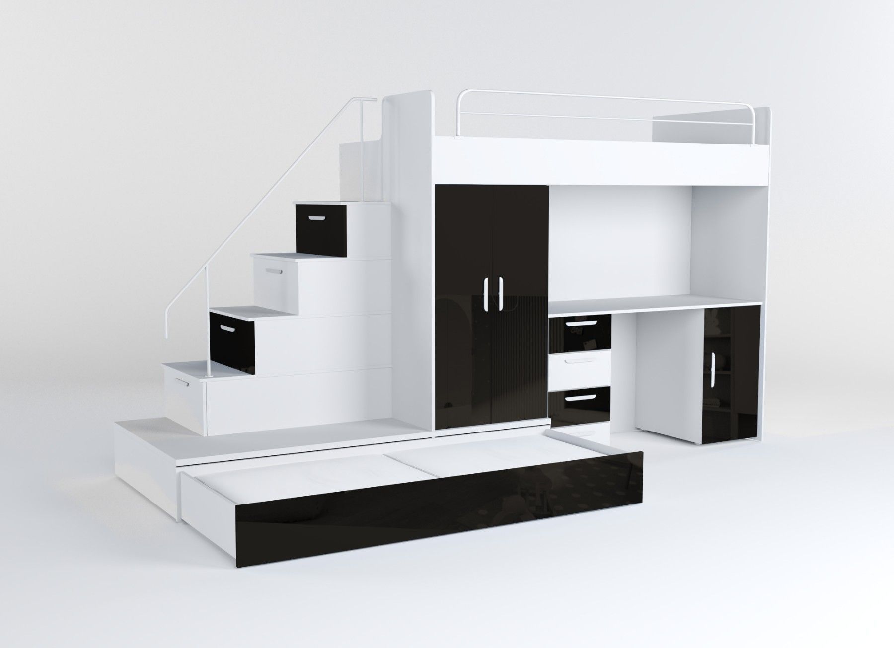 Hochbett mit Schreibtisch - TOMI 5 Möbel aus 16 mm dicker Laminatplatte mit erhöhter Kratzfestigkeit Räucher mit PVC-Furnier Acrylfolie-beschichtetes Set für Glanzeffekt Möbelkörper - matt Das Set besteht aus bettkörper, Schaumstoffmatratze in der unteren ausziehbaren Schublade, Schrank, Treppe zum