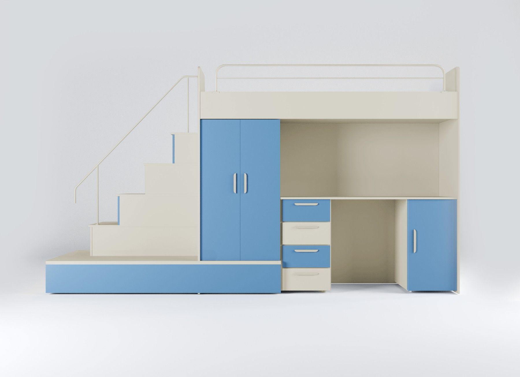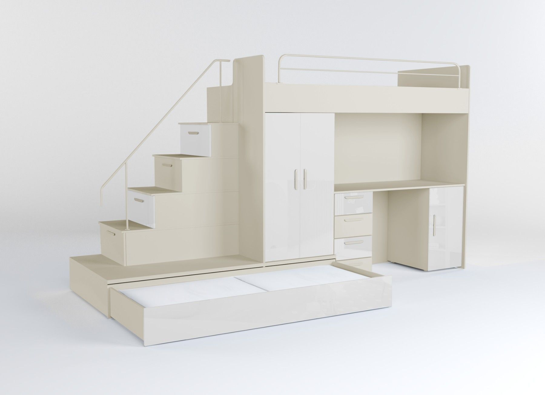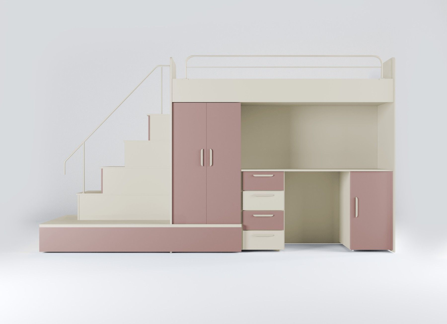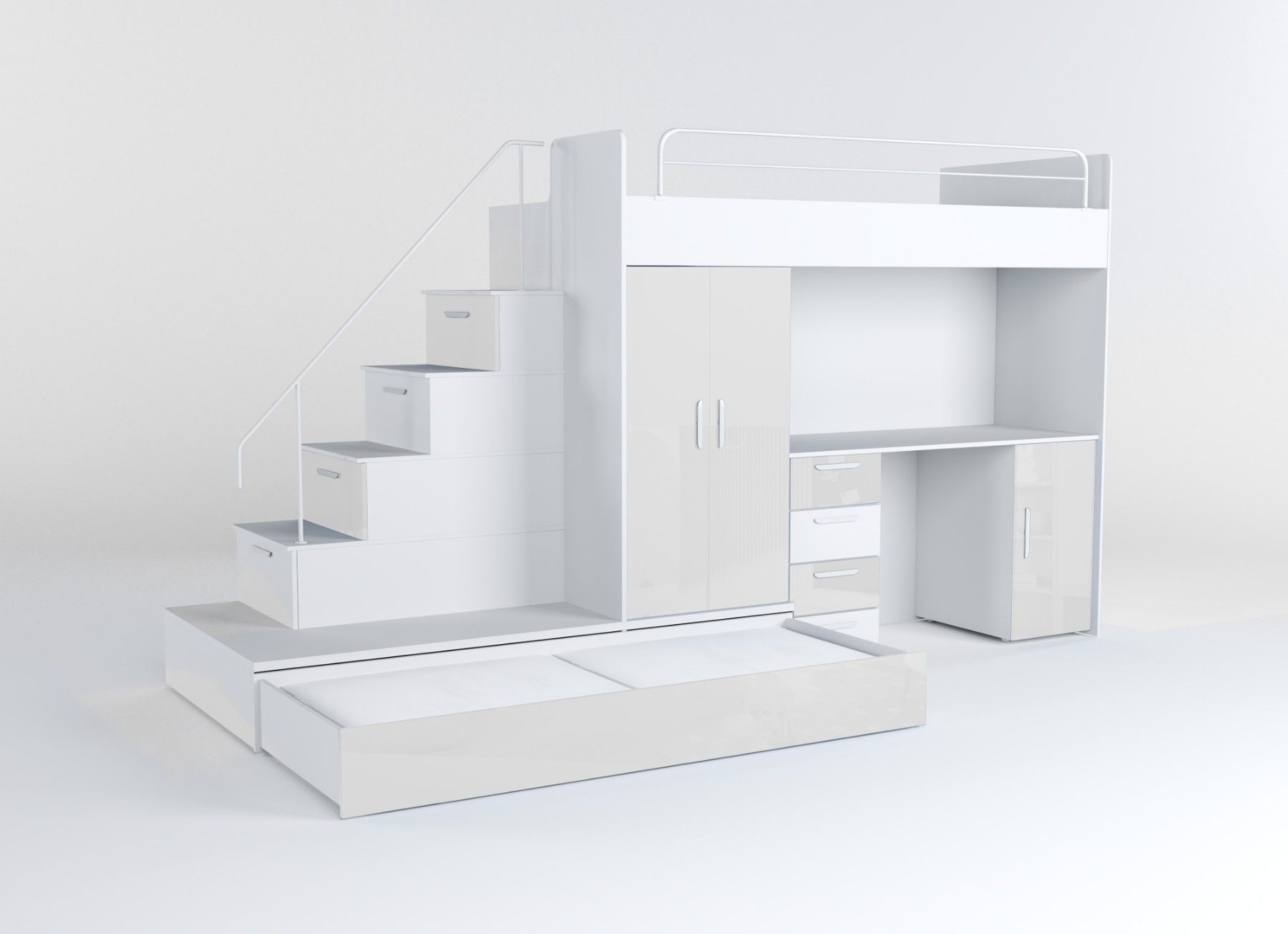 Hochbett mit Schreibtisch - TOMI 5 Möbel aus 16 mm dicker Laminatplatte mit erhöhter Kratzfestigkeit Räucher mit PVC-Furnier Acrylfolie-beschichtetes Set für Glanzeffekt Möbelkörper - matt Das Set besteht aus bettkörper, Schaumstoffmatratze in der unteren ausziehbaren Schublade, Schrank, Treppe zum