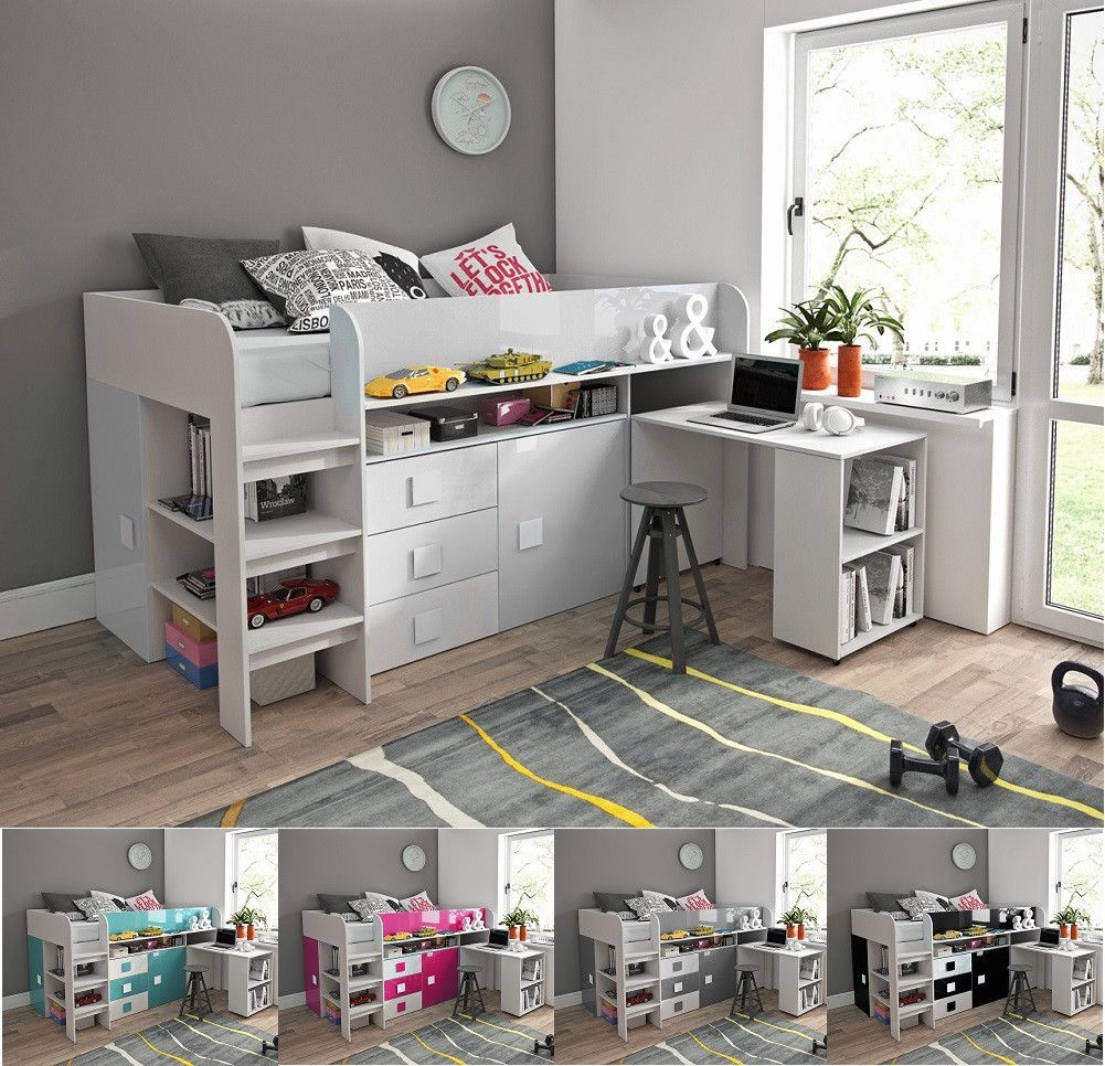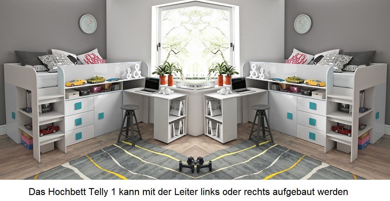Hochbett Etagenbett mit Schrank Schreibtisch Regal TELLY 1 hochglanz weiß grau rosa