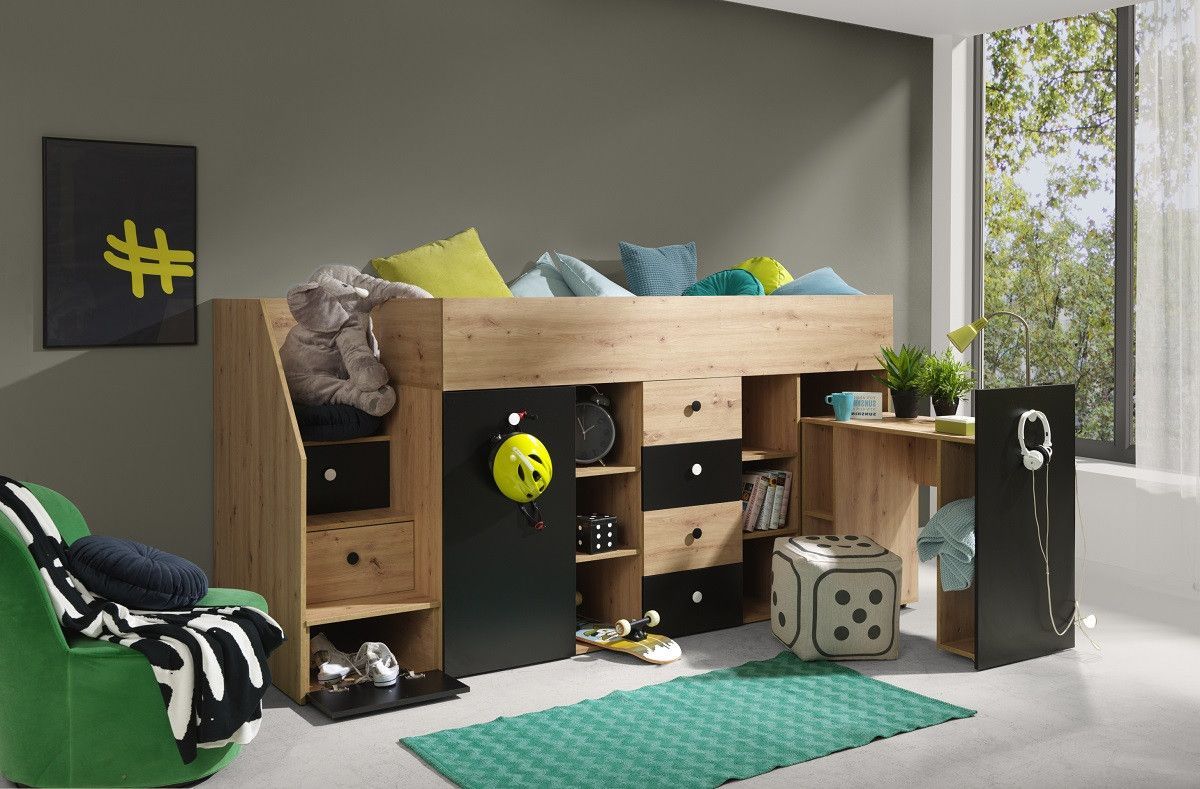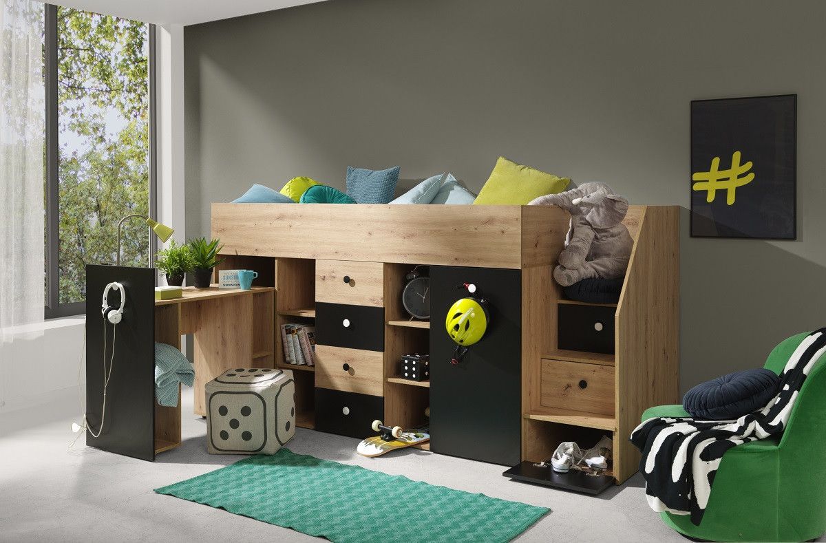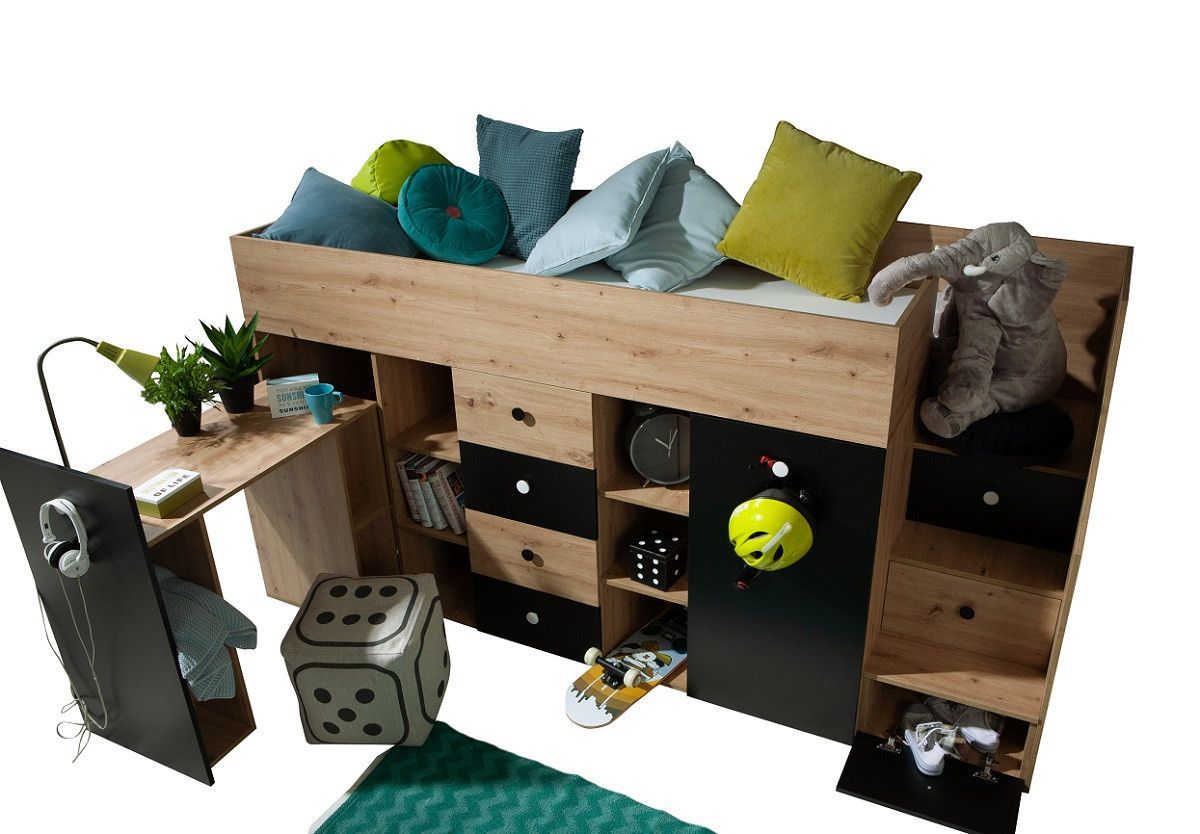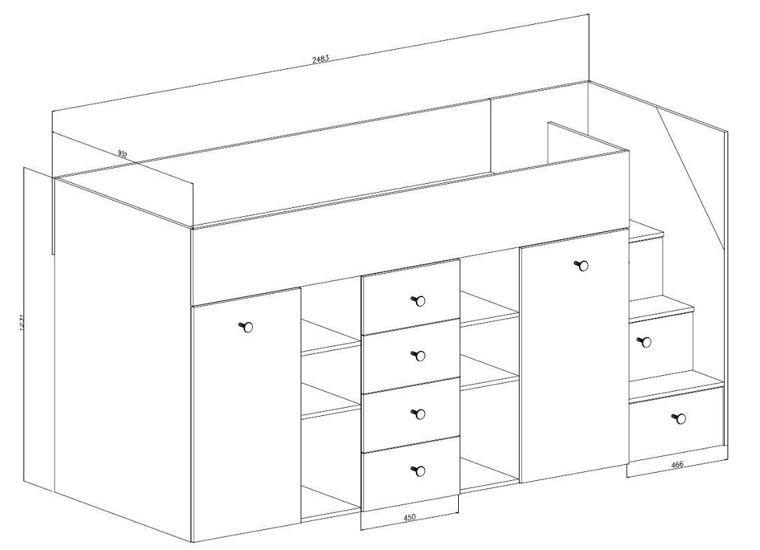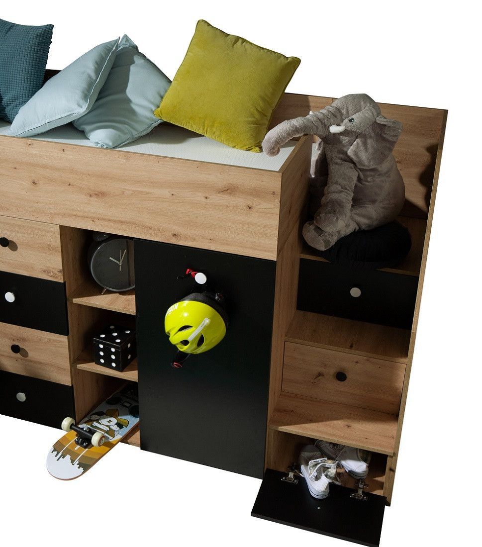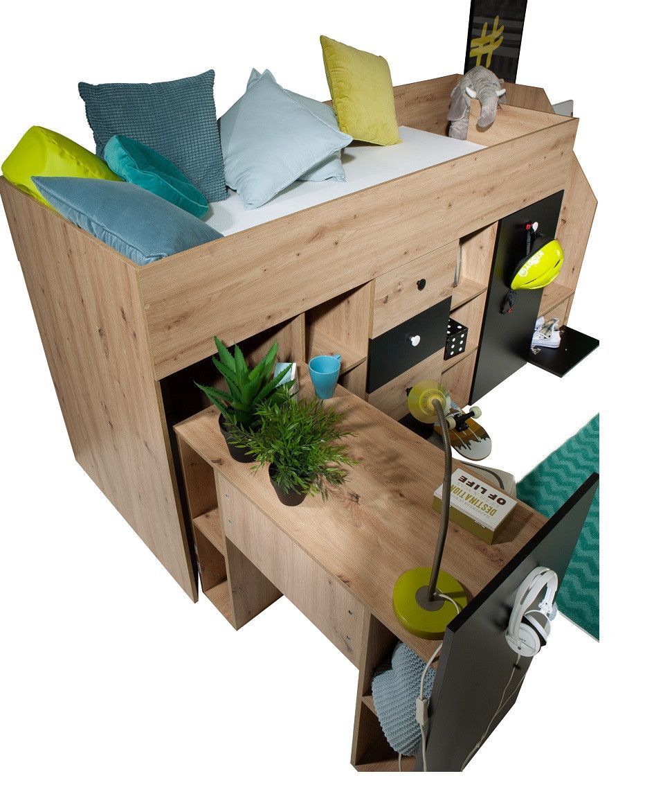 Hochbett mit Schreibtisch & Schrank Sam 3 eiche weiß schwarz Maße : Hochbett : Gesamtbreite - 249 Gesamthöhe - 123 Gesamttiefe - 93 Liegefläche: 200 x 90cm Schreibtisch : Breite - 88, Höhe - 76, Tiefe - 45,5 Breite unter dem Schreibtisch (Platz für die Beine) - 50cm Schrank - Innenmaße : Breite
