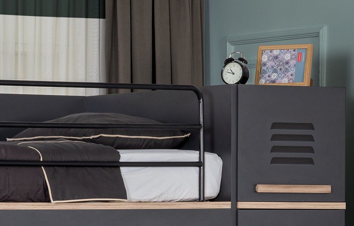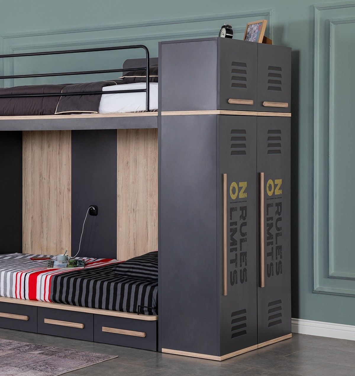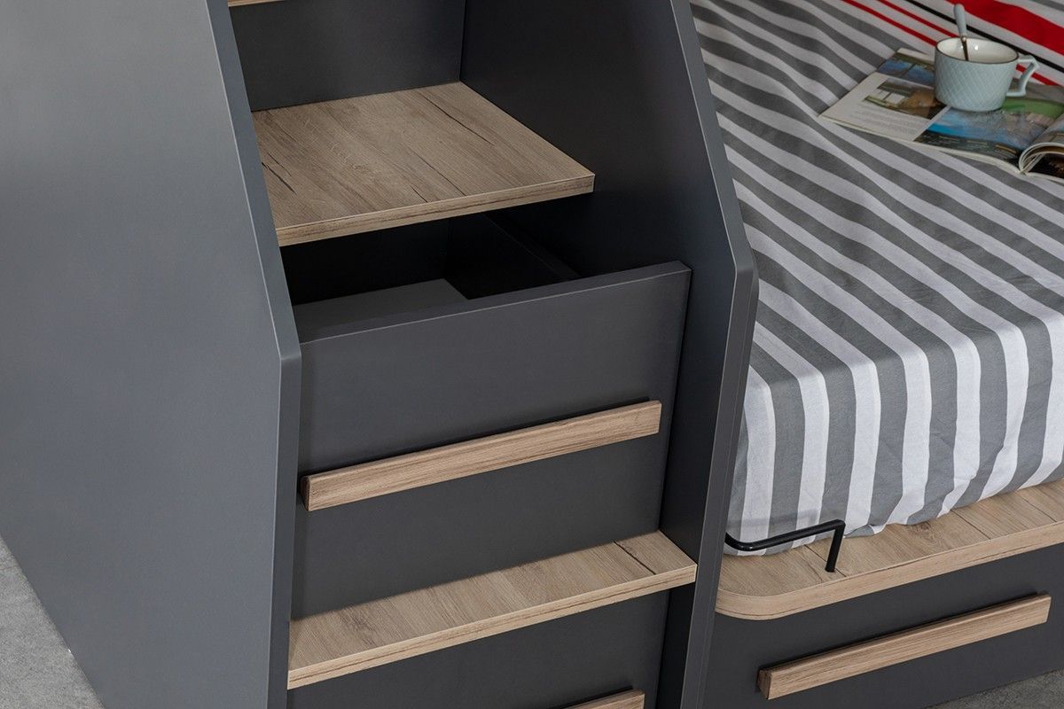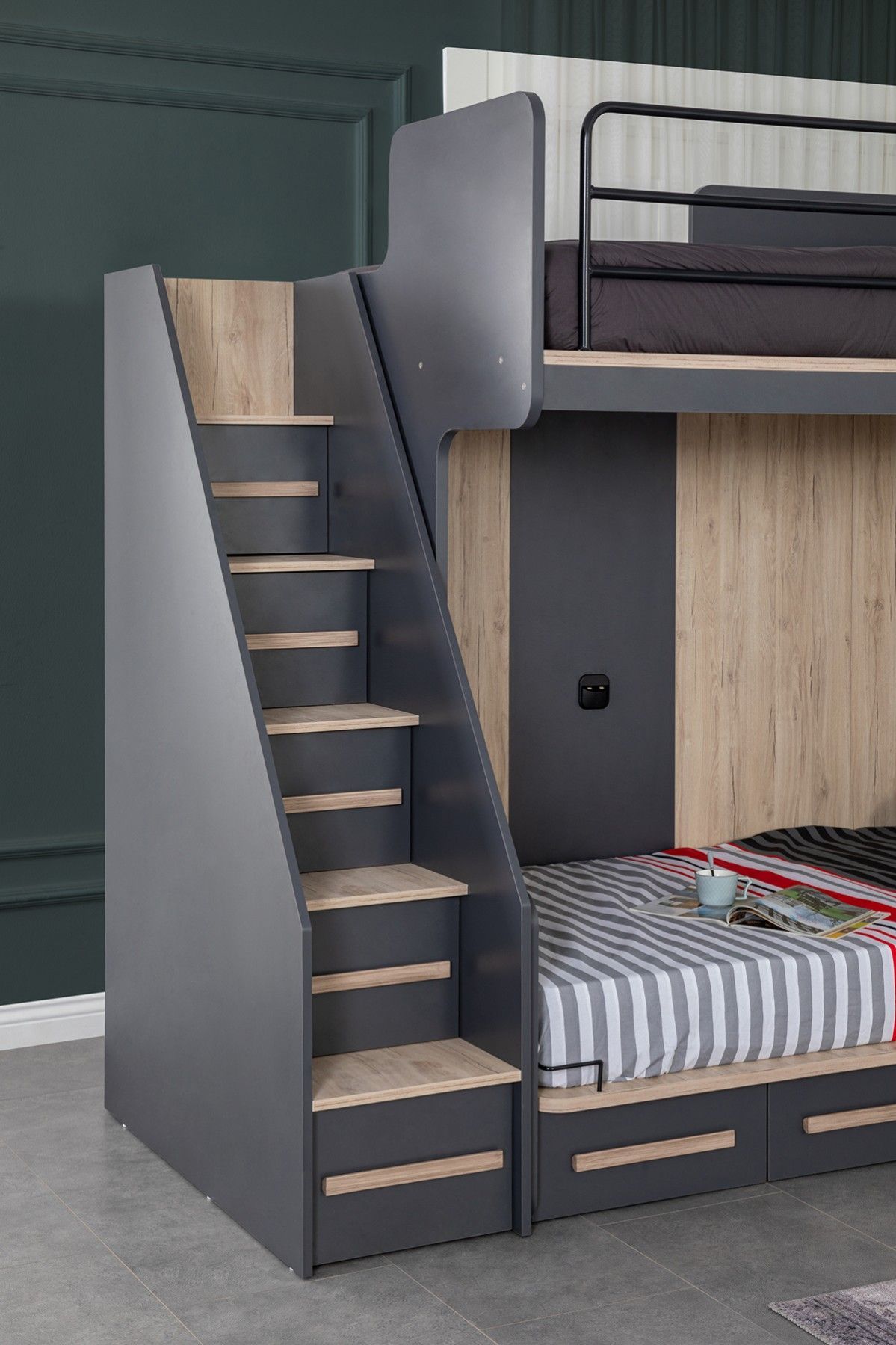 Dieses moderne Kinderhochbett Stil mit Treppe und einem 1 türigen Kleiderschrank bietet Ihnen viel Stauraummöglichkeiten. Es ist mit Lattenrost. Außerdem hat es integrierten Bluetooth-Lautsprecher und USB-Anschluss für Handy & Co. Schöne Abende beim Musik oder Hörbuch hören steht dann nichts mehr im