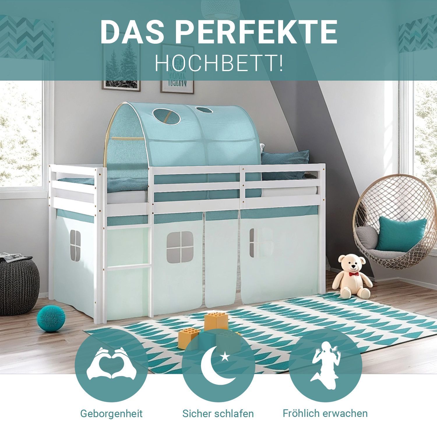Hochbett Kinder 90x200 cm Kinderbett Kinderhochbett Stockbett Tunnel Vorhang Grün