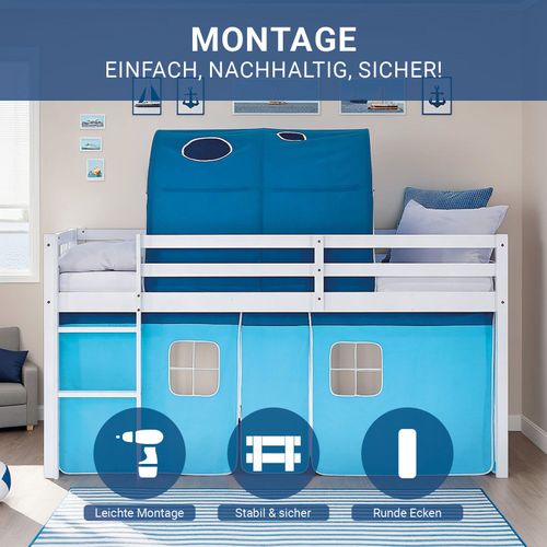 Hochbett Kinder 90x200 cm Kinderbett Kinderhochbett Stockbett Tunnel Vorhang Turm