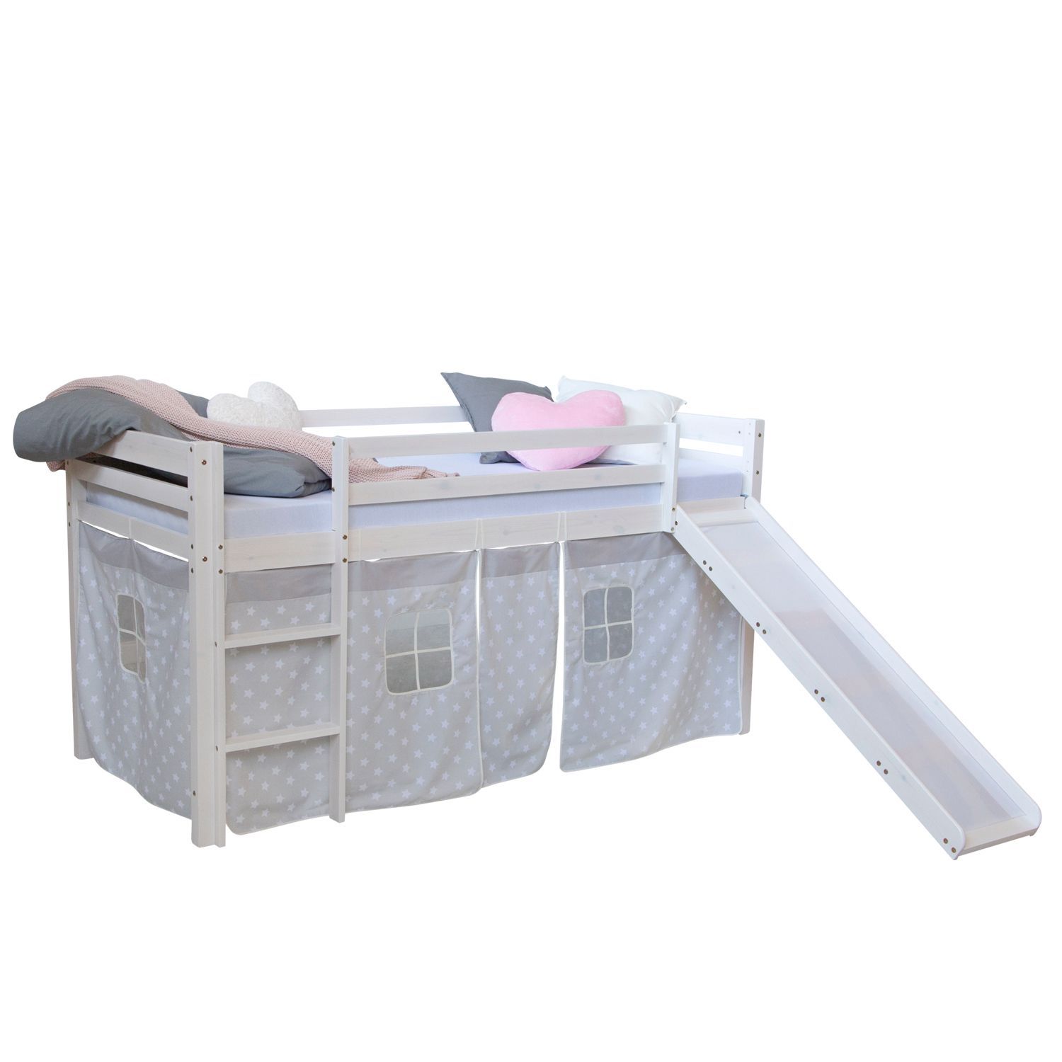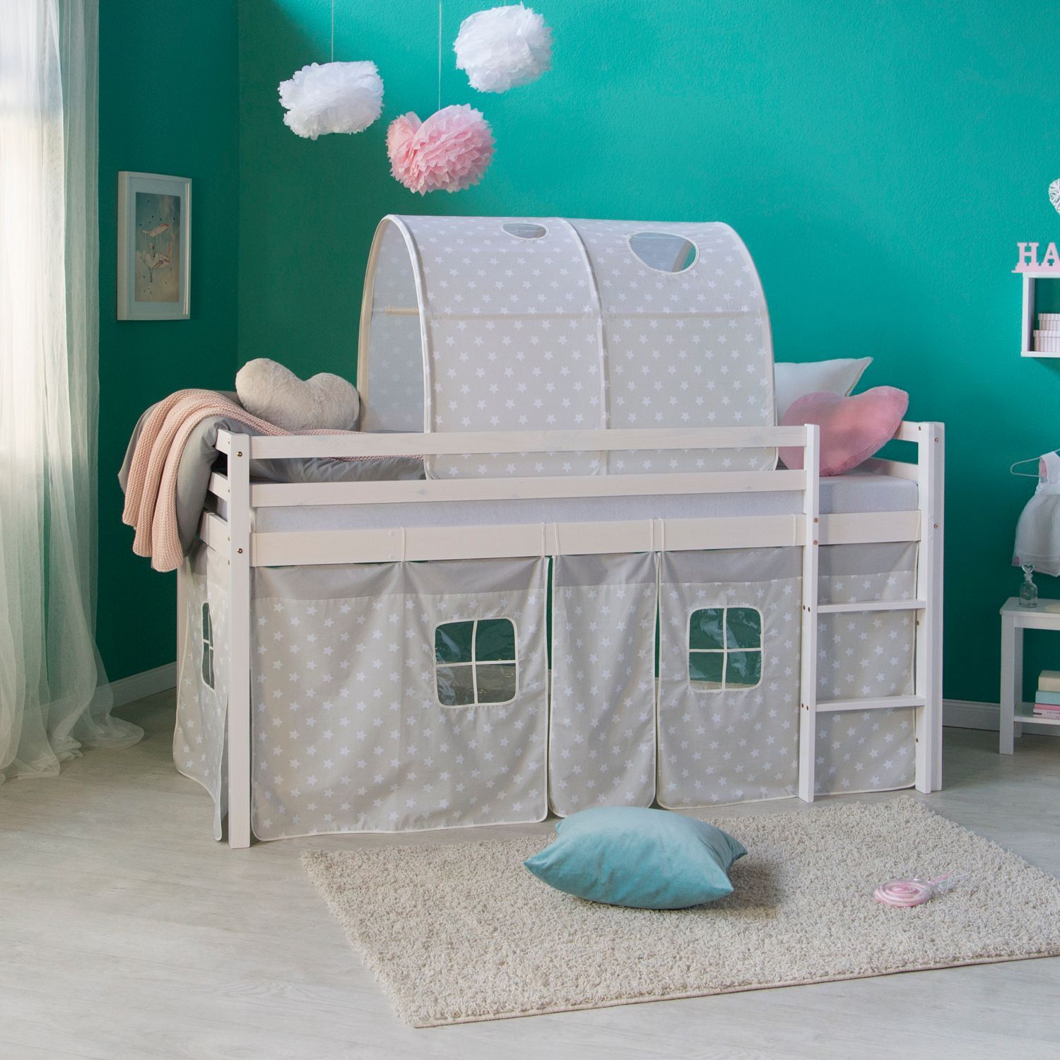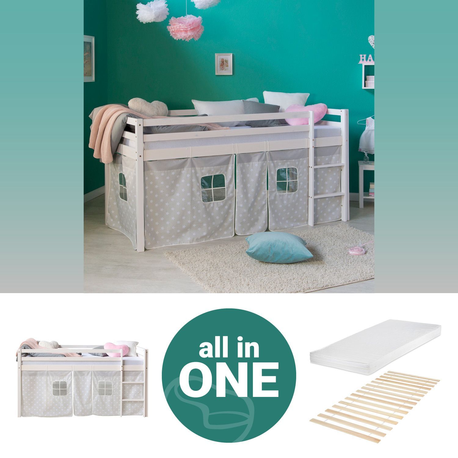 Hochbett mit Lattenrost 90x200 cm Kinderbett Leiter Holz Kiefer Vorhang Sterne