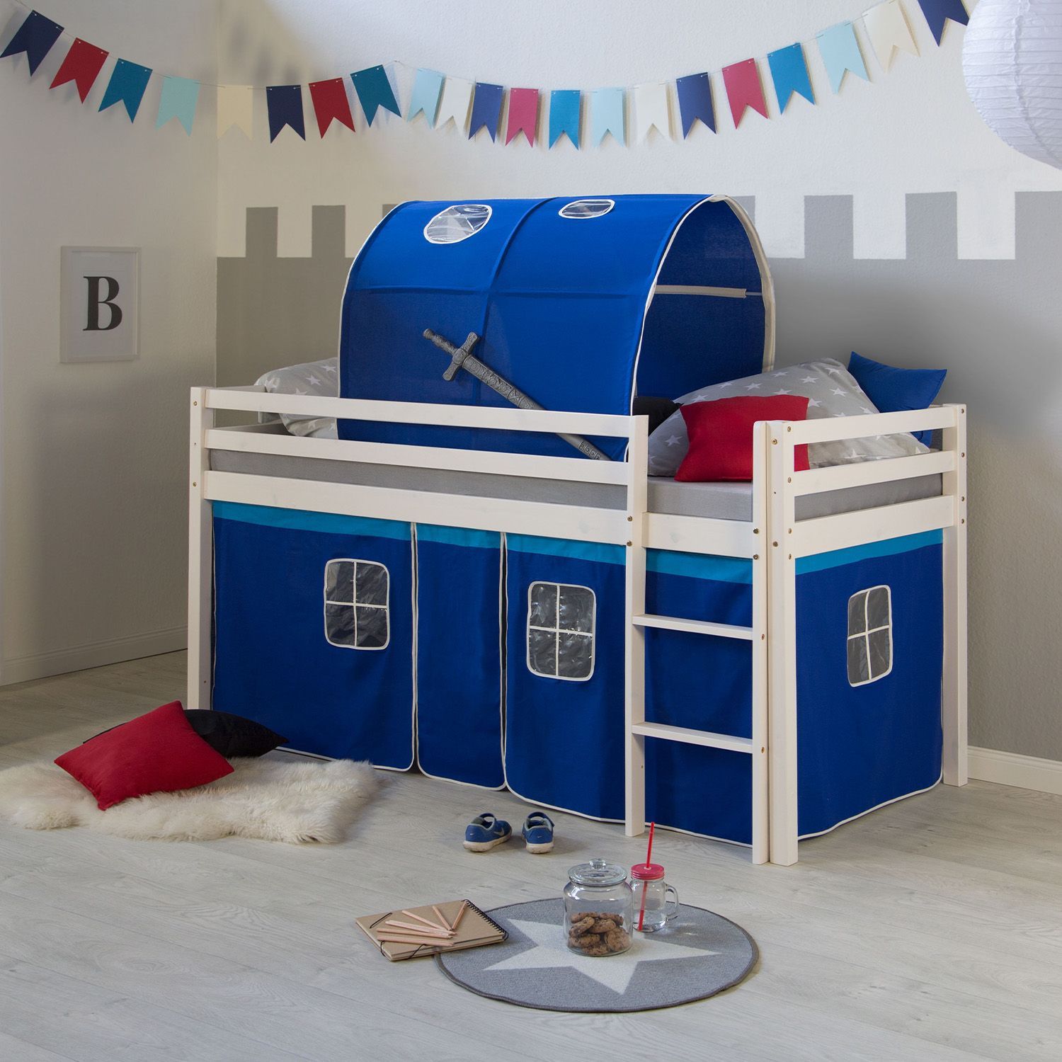 Hochbett mit Lattenrost 90x200 Spielbett Kinderbett Tunnel Vorhang blau Holz Kiefe...