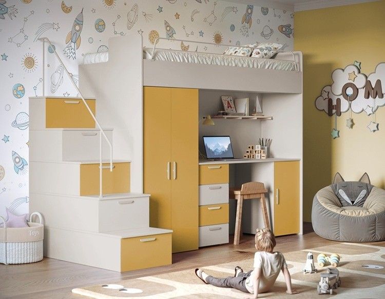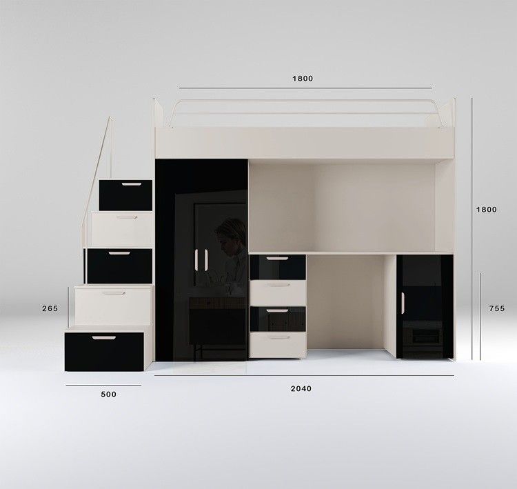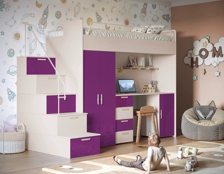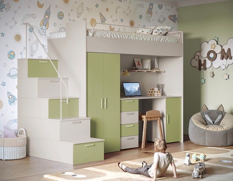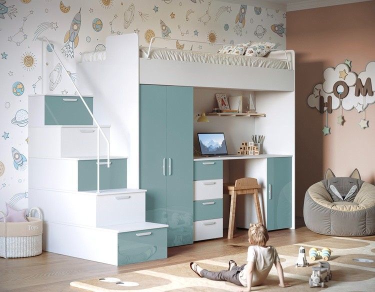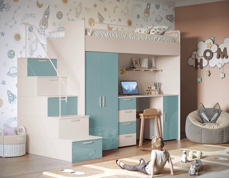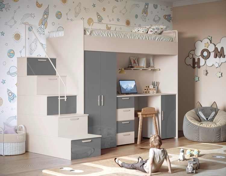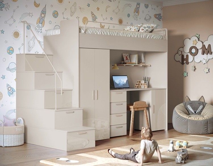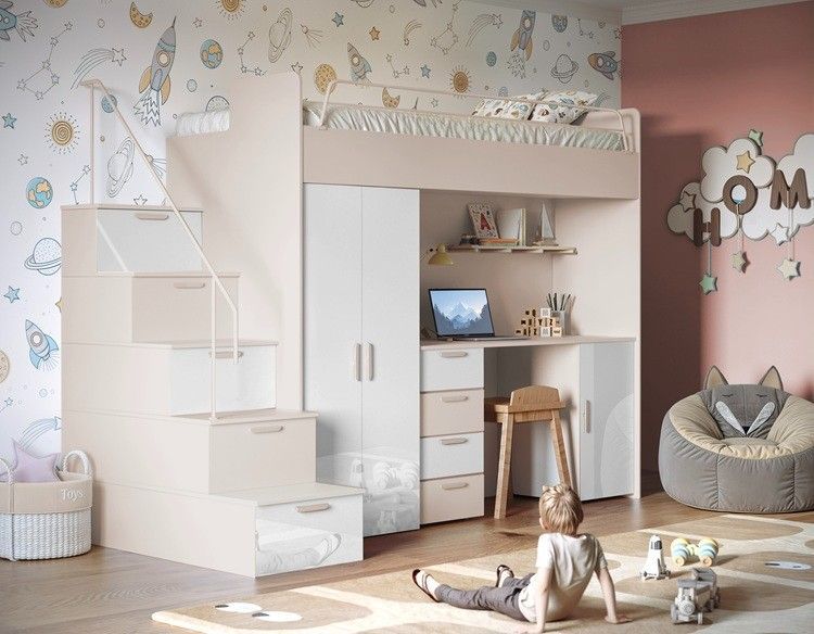 Hochbett mit Schreibtisch TOMI 4S - Schrank, Regale in den Treppen, lanz, Matt