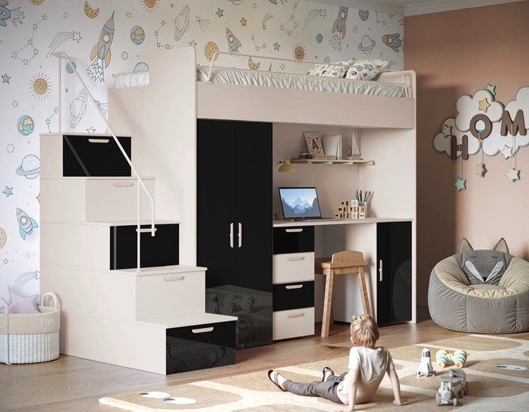 Hochbett mit Schreibtisch TOMI 4S - Schrank, Regale in den Treppen, lanz, Matt