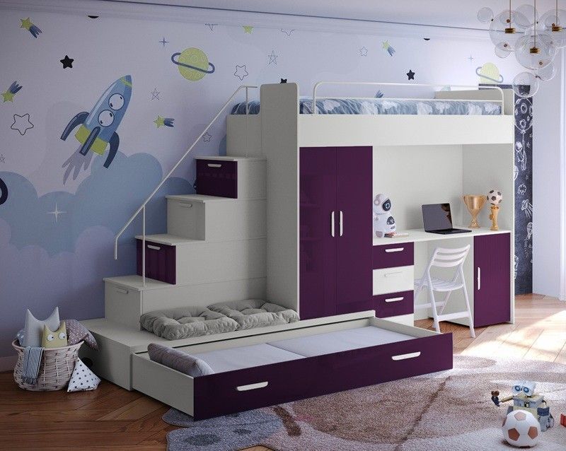 Hochbett mit Schreibtisch TOMI 5 , Schrank, Treppe und Gästebett in Hochglanz