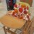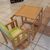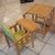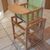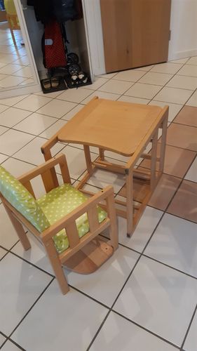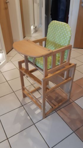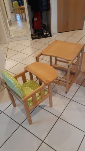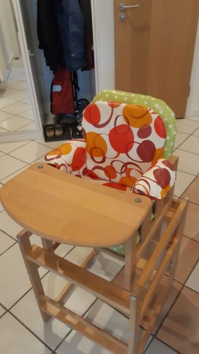 Hochstuhl, Fabr. Herlag, Buche massiy, Holzteile neu lackiert, Unterseite der Tischplatte mit Malspuren, Sitz und Lehne mit neuem Kunststoffbezug, incl. Sitzverkleinerung
