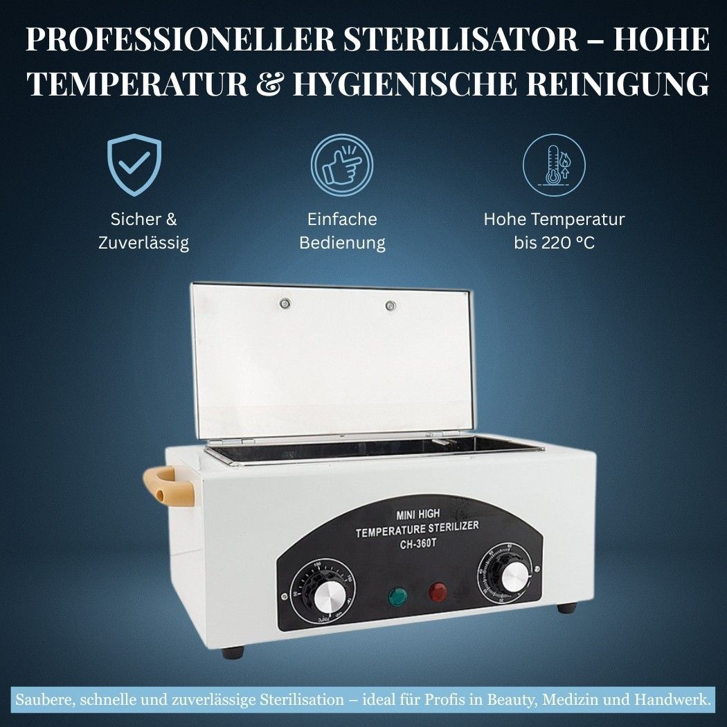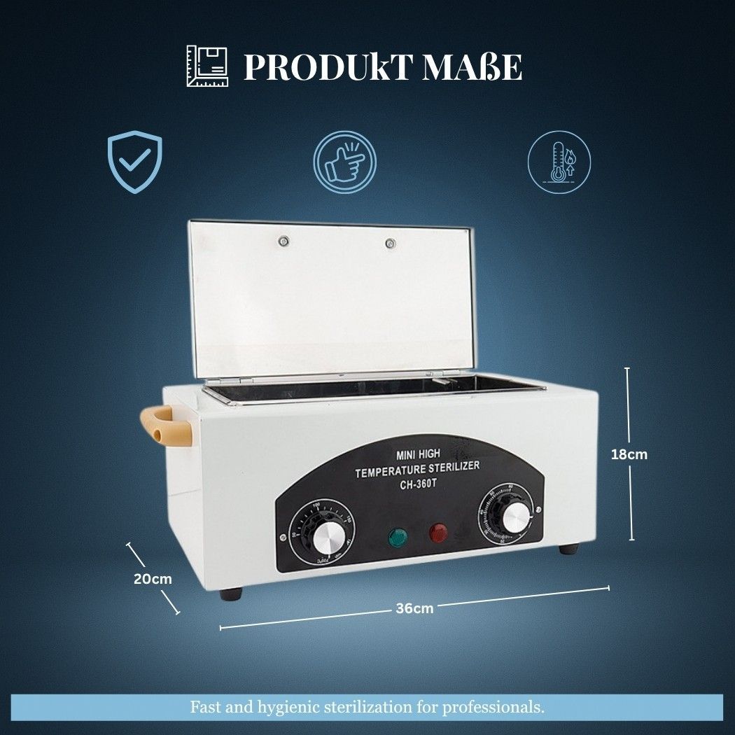 CH-360T Hochtemperatur-Sterilisator – bis 220 °C Professioneller Sterilisator für Beauty-, Tattoo-, Medizin- und Werkstattbedarf. Ideal zur hygienischen Reinigung von Metallwerkzeugen – schnell, sicher und ohne Chemikalien. Eigenschaften Bis 220 °C – effektive Hochtemperatur-Sterilisation 300 W Leis
