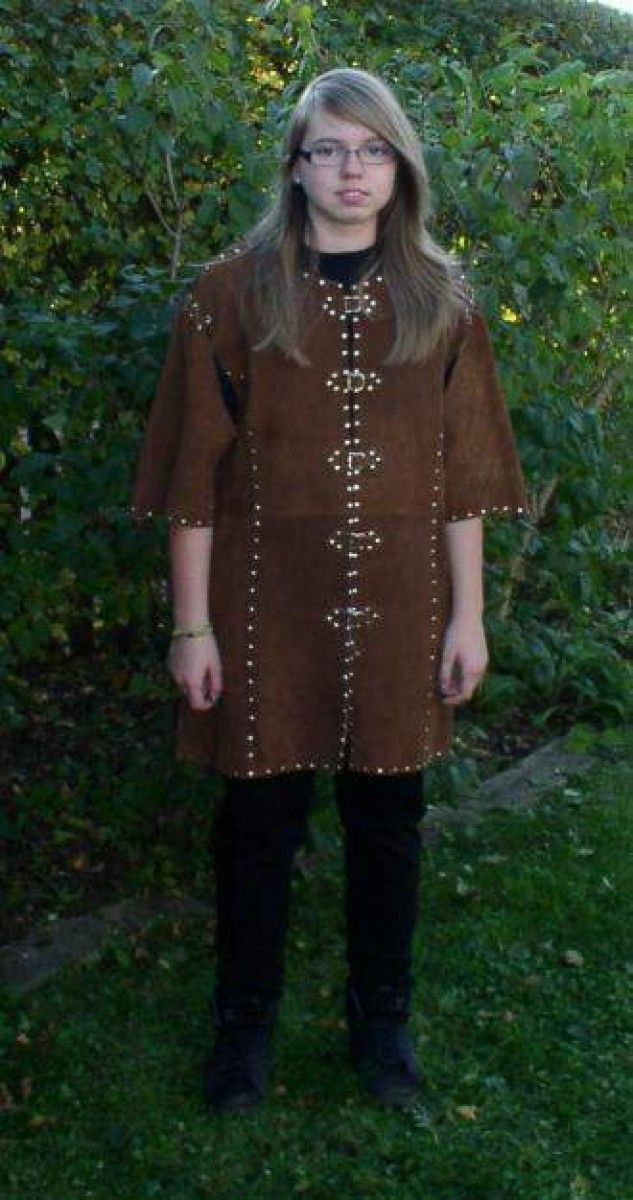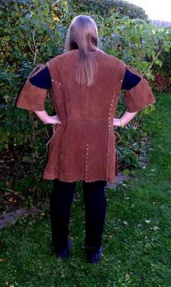 Mittelalterliche Tunika ohne Ärmel aus Wildleder zum Tragen über dem Hemd. Am vorderen Saum geschlitzt zum bequemeren Sitzen. Die Tunika ist am Kragen vorne über ein band zum Schnüren, dadurch wird das An- und Ausziehen erleichtert. Die Tunika ist ab dem Ärmelausschnitt gerade geschnitten.