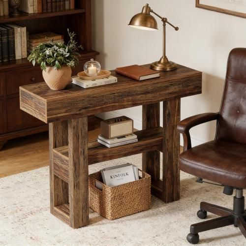 Dieser schmale Konsolentisch im modernen Schuh-Design eignet sich ideal als Empfangstisch, Flurtisch oder Sofatisch. Die braune MDF-Oberfläche wirkt schlicht und vielseitig. Gewicht: 45,10 kg. Paketmaß: 47,28 × 14,18 × 7,88 cm. Einzelprodukt.