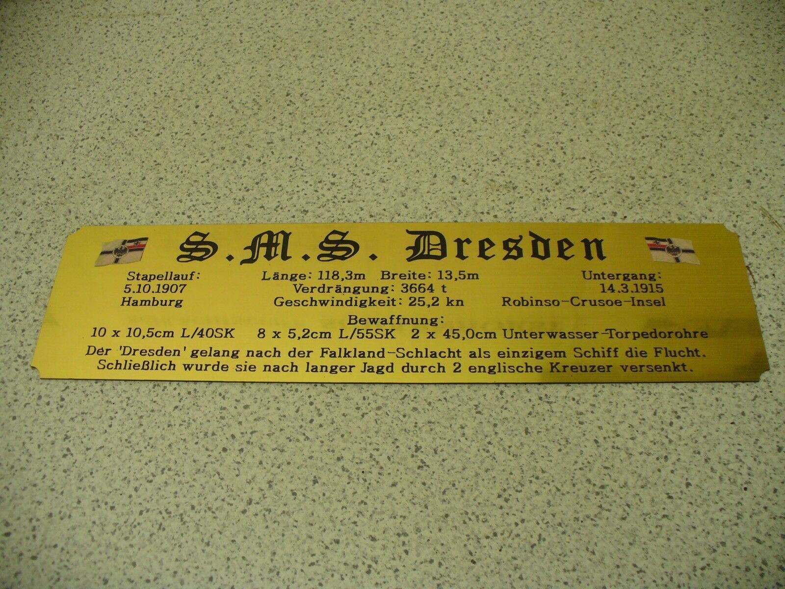 Sie bieten hier auf: 1 Hohes Namensschild für Modellständer - SMS Dresden - mit farbigen Logos und verschiedenen Daten (siehe Bild) goldfarbig mit schwarzem Schriftzug (auch in weiss - oder silberfarbig möglich --> dann bitte angeben) Abmessung: 275 x 72 x 1,5 mm Das Schild ist von mir mit einer
