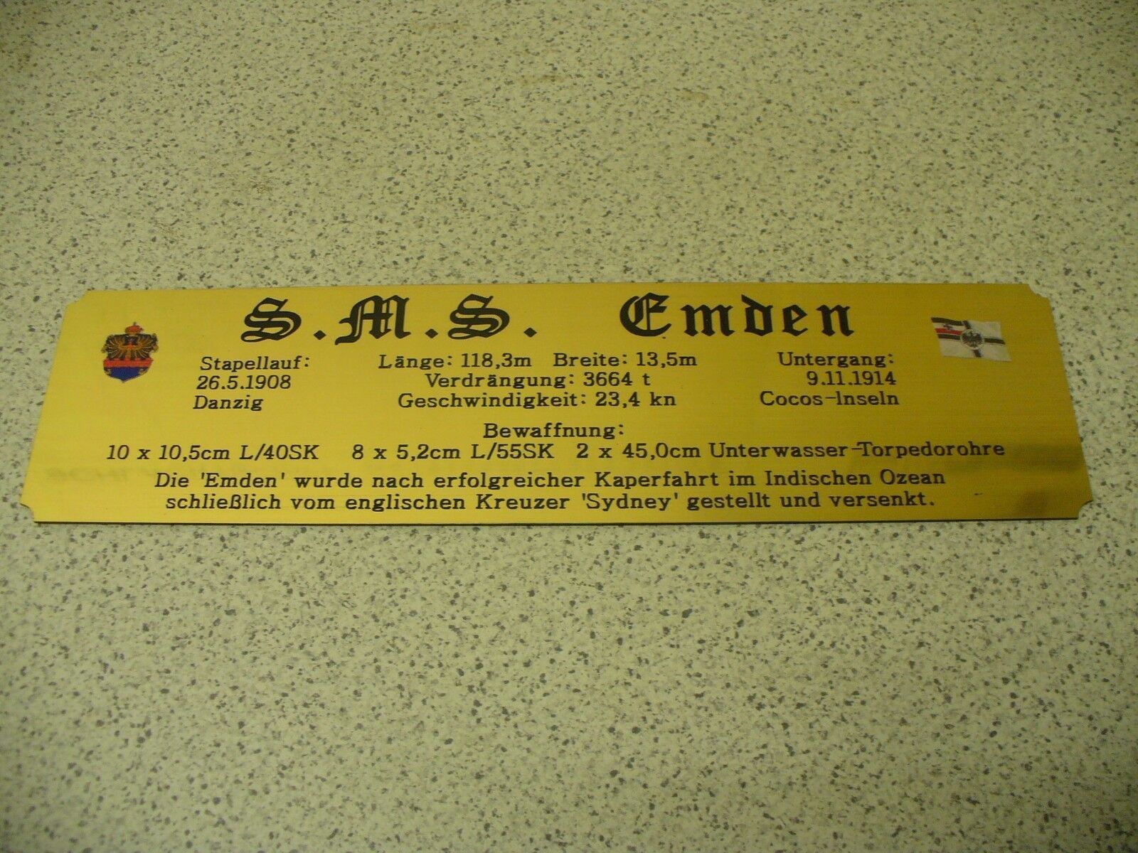 Sie bieten hier auf: 1 Hohes Namensschild für Modellständer - SMS Emden - mit farbigen Logos und verschiedenen Daten (siehe Bild) goldfarbig mit schwarzem Schriftzug (auch in weiss - oder silberfarbig möglich --> dann bitte angeben) Abmessung: 275 x 72 x 1,5 mm Das Schild ist von mir mit einer CN
