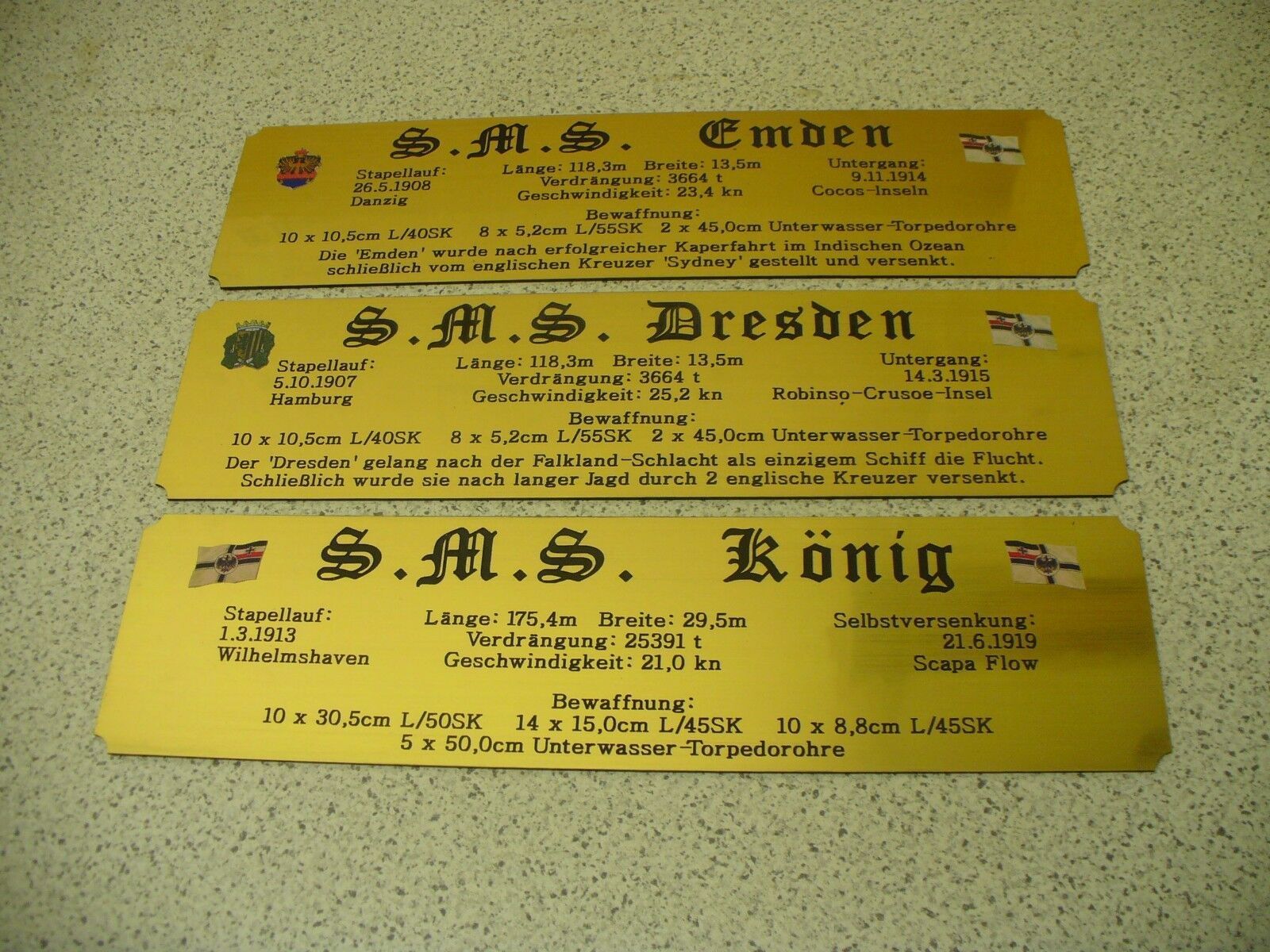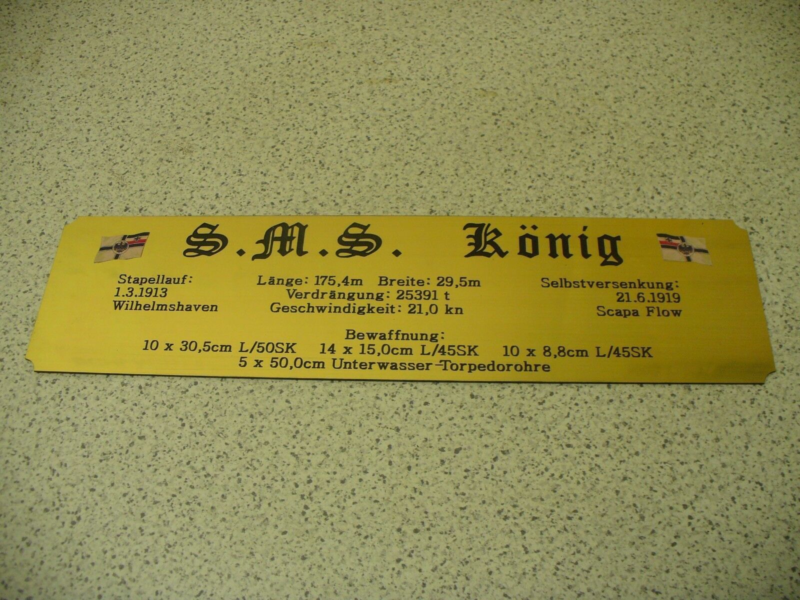 Sie bieten hier auf: 1 Hohes Namensschild für Modellständer - SMS König - mit farbigen Logos und verschiedenen Daten (siehe Bild) goldfarbig mit schwarzem Schriftzug (auch in weiss - oder silberfarbig möglich --> dann bitte angeben) Abmessung: 275 x 72 x 1,5 mm Das Schild ist von mir mit einer CN