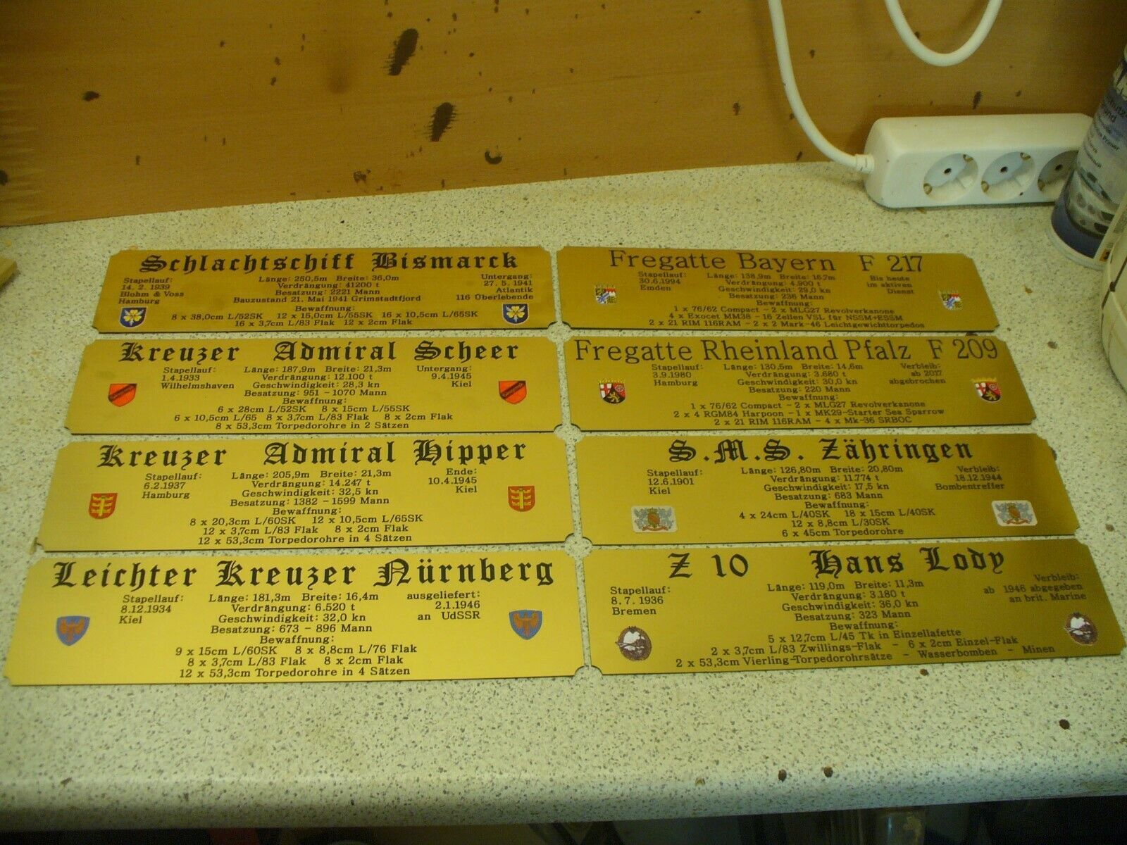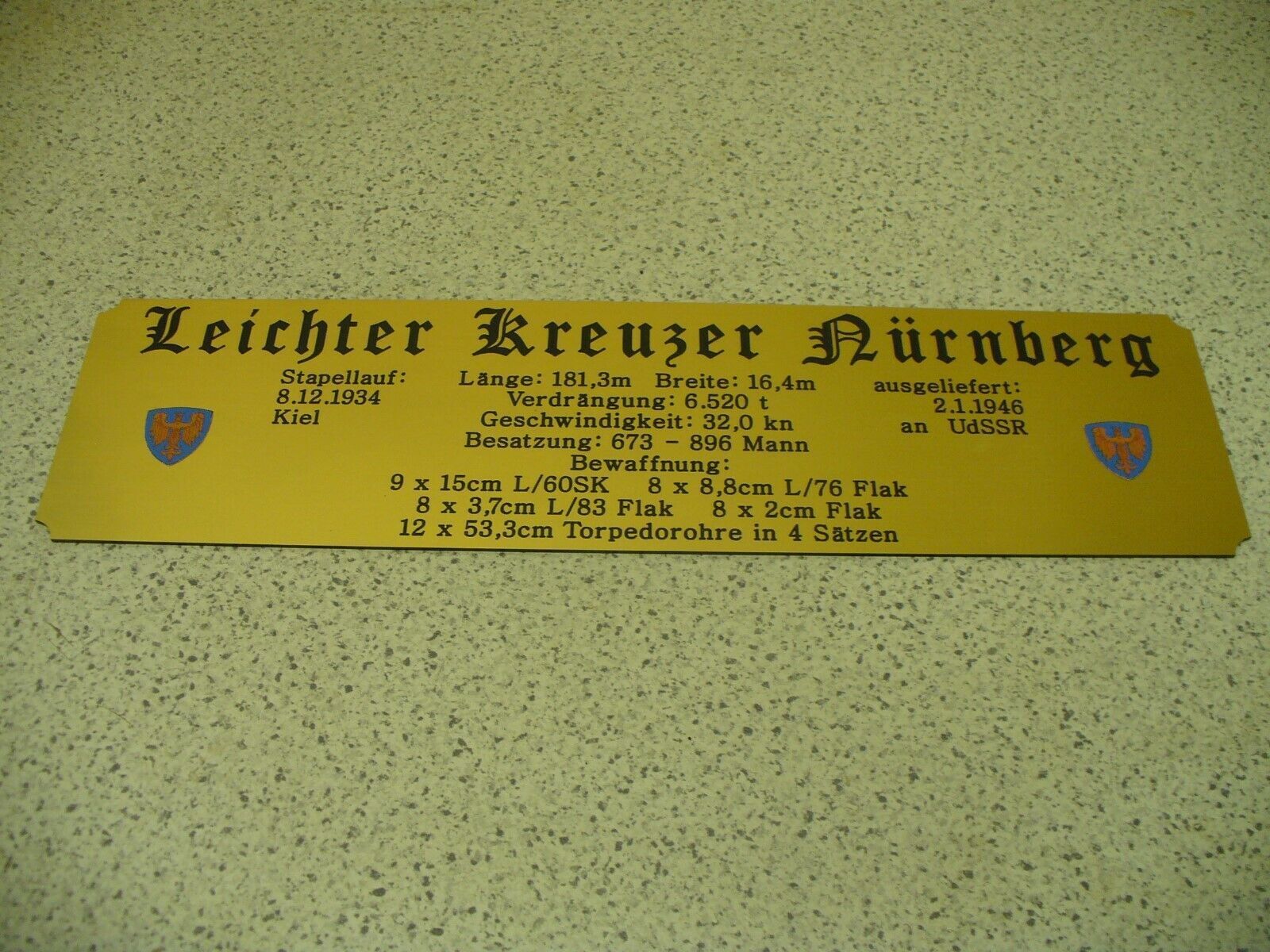 Sie bieten hier auf: 1 Hohes Namensschild für Modellständer - Leichter Kreuzer Nürnberg - mit farbigen Logos und verschiedenen Daten (siehe Bild) goldfarbig mit schwarzem Schriftzug (auch in weiss - oder silberfarbig möglich --> dann bitte angeben) Abmessung: 275 x 72 x 1,5 mm Das Schild ist von