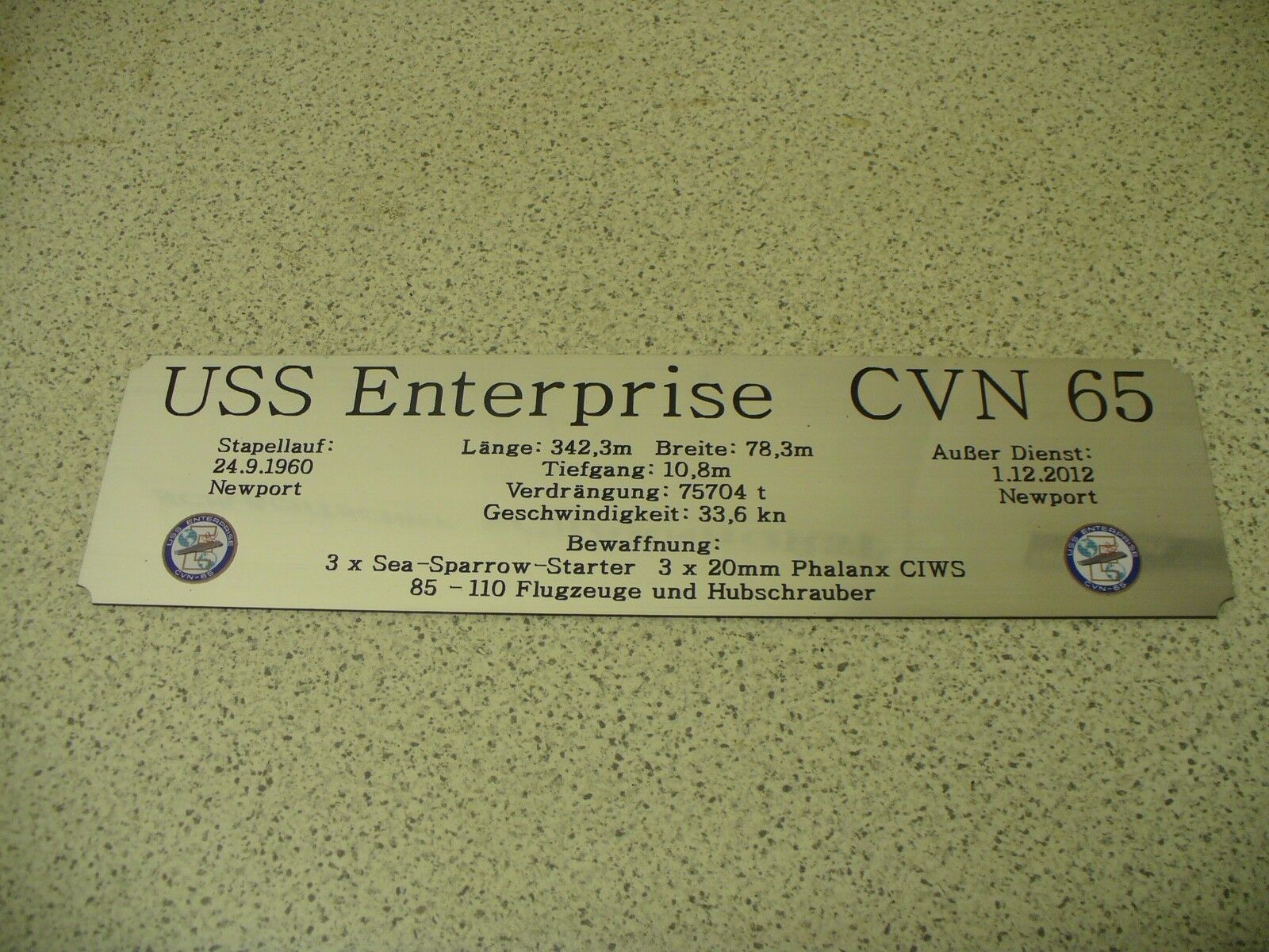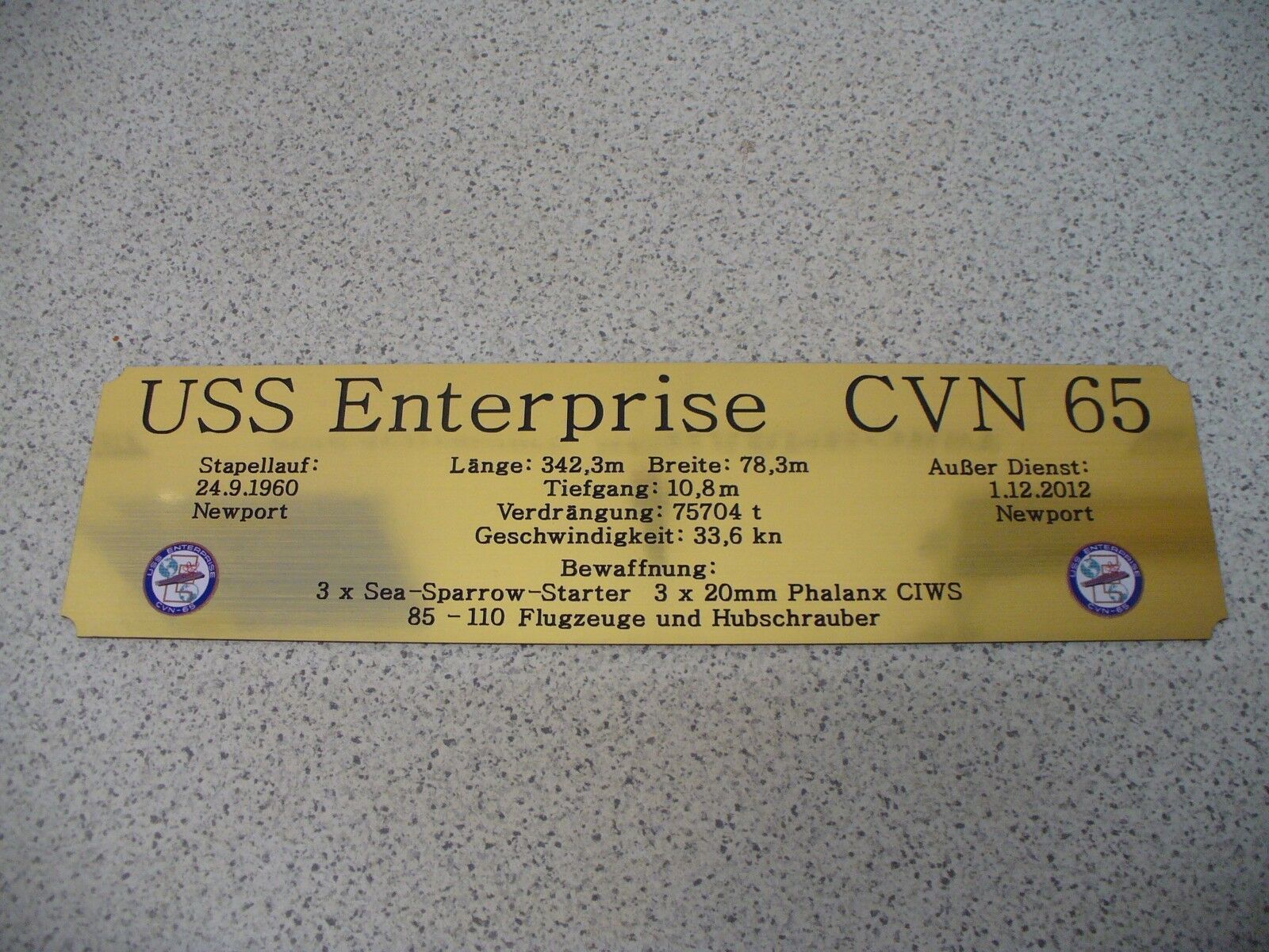 Sie bieten hier auf: 1 Hohes Namensschild für Modellständer - USS Enterprise CVN65 - mit farbigem Schiffswappen und verschiedenen Daten (siehe Bild) goldfarbig mit schwarzem Schriftzug (auch in weiss - oder silberfarbig möglich --> dann bitte angeben) Abmessung: 275 x 72 x 1,5 mm Das Schild ist v