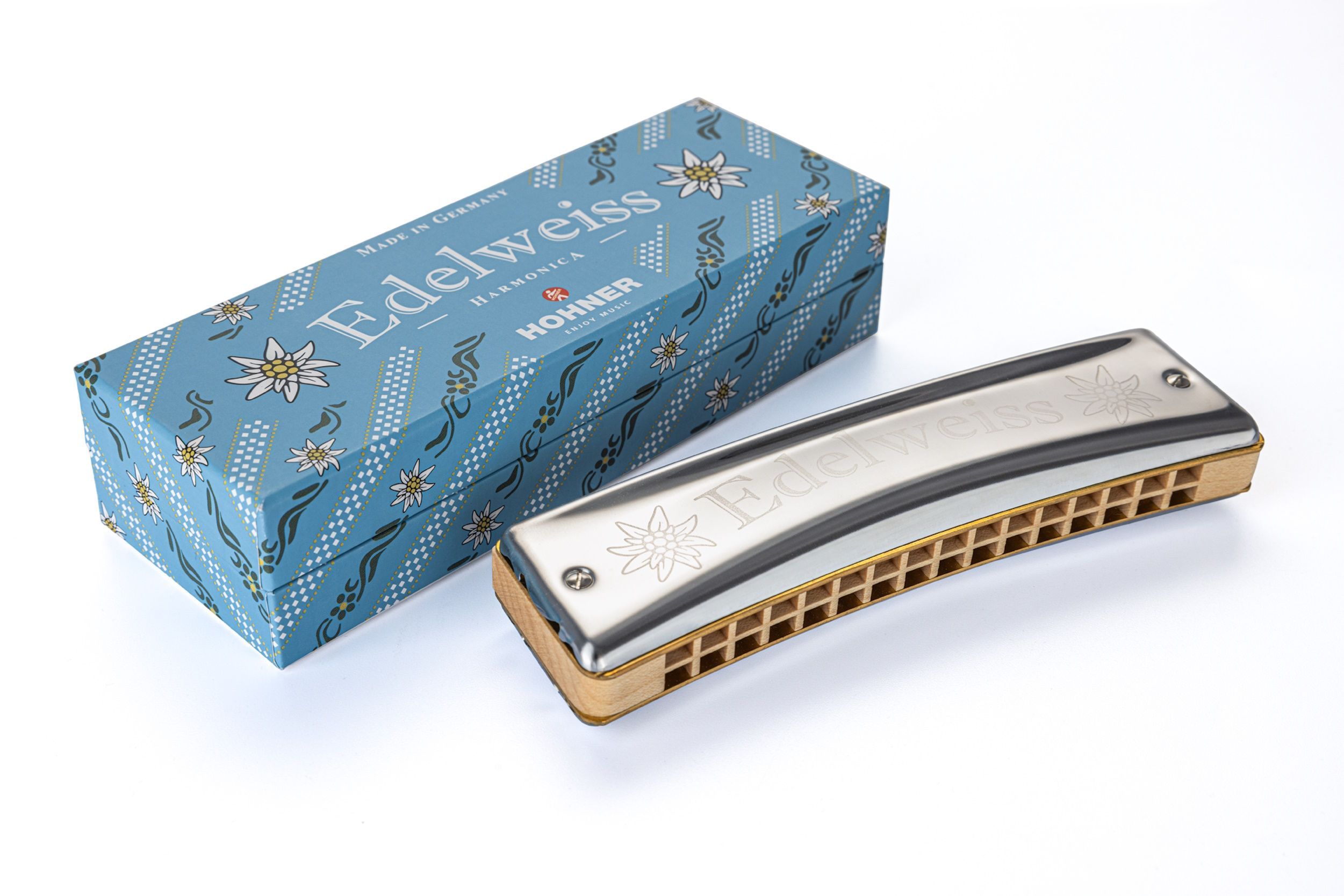 Hohner Edelweiss 32 C Wie die unverwechselbare und symbolträchtigste Alpenblume ist auch die EDELWEISS Mundharmonika mit ihrem warmen, wohltuenden und harmonischen Klang ein echtes Original. Mit ihrem klassischen Design, ihrer handschmeichelnden Form und ihrem unverwechselbaren Sound ist sie der Sta