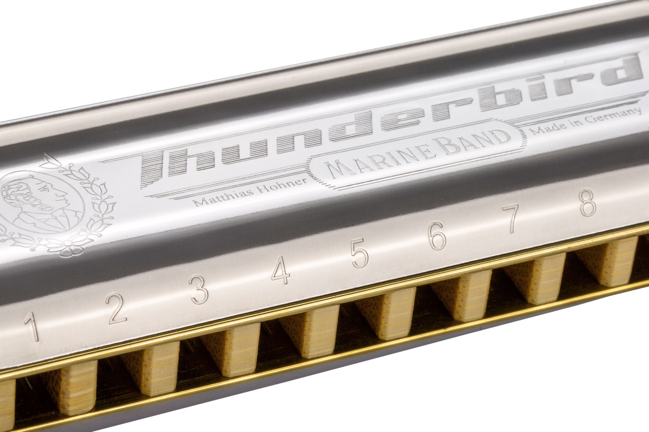 HOHNER Mundharmonika, Marine Band - Thunderbird, C-Low Die in Zusammenarbeit mit Joe Filisko entwickelte Thunderbird ist mit einem konisch geformten unteren Deckel ausgestattet. Hier haben die Zugzungen genug Raum, um auch in den tiefsten Lagen frei schwingen zu können. Erleben Sie den einzigartigen