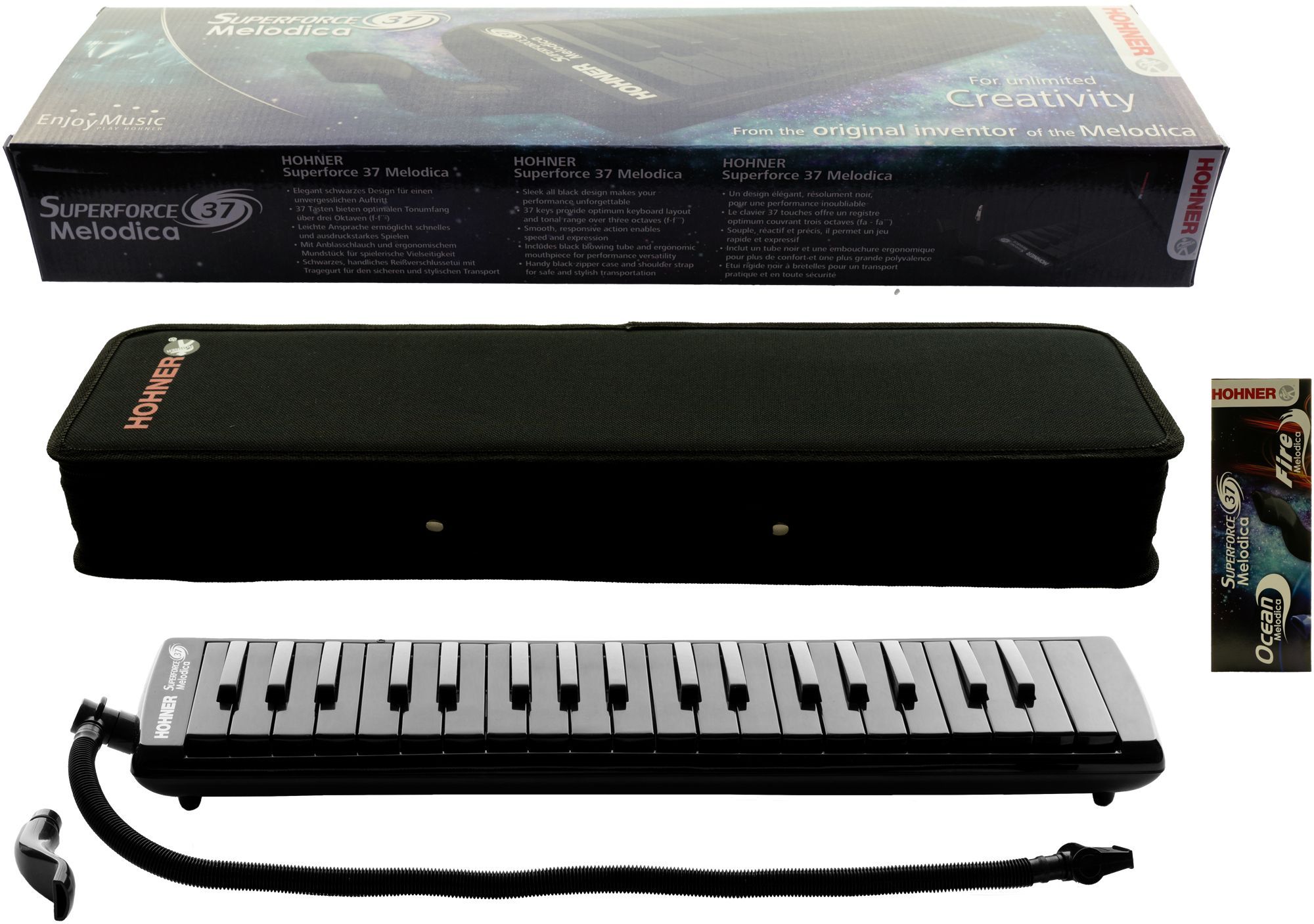 Hohner Melodica Superforce 37 Cooler Look und toller Sound: Hohner Superforce 37! Nun gibt es die beliebte Melodica Student auch mit 37 Tasten und 'sleek black' Design. Die leichtgängige Tastatur und schnelle Ansprache machen selbst rasante Läufe und turbulente Rhythmen zum Kinderspiel. Ein Muss für