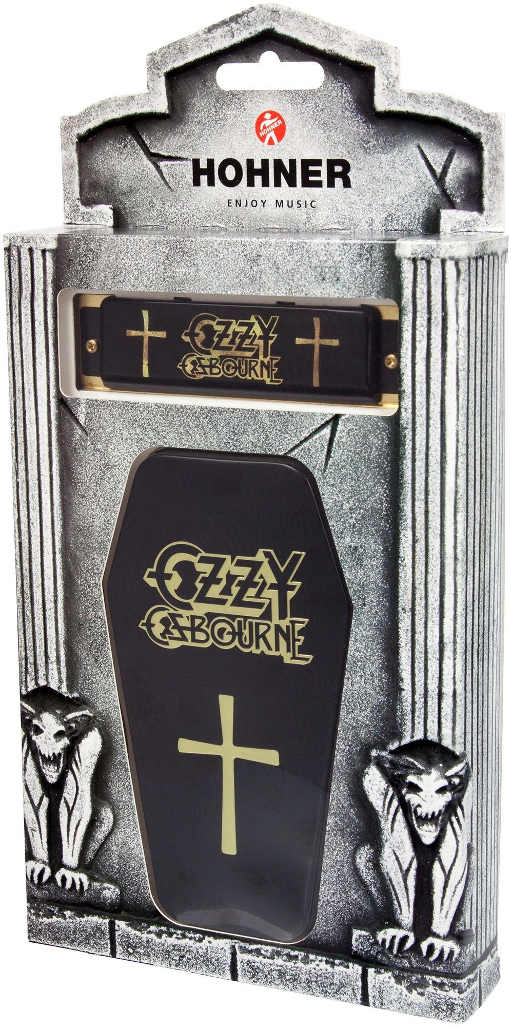 Hohner Ozzy Osbourne Signature Harp Nach den beliebten Signature-Modellen von Bob Dylan und John Lennon bringt Hohner nun die wohl 'hardest rocking harmonica' auf den Markt! In enger Kooperation mit der Rock-Legende Ozzy Osbourne entstand seine eigene Gothic-Harp in unverwechselbarem Design und mark