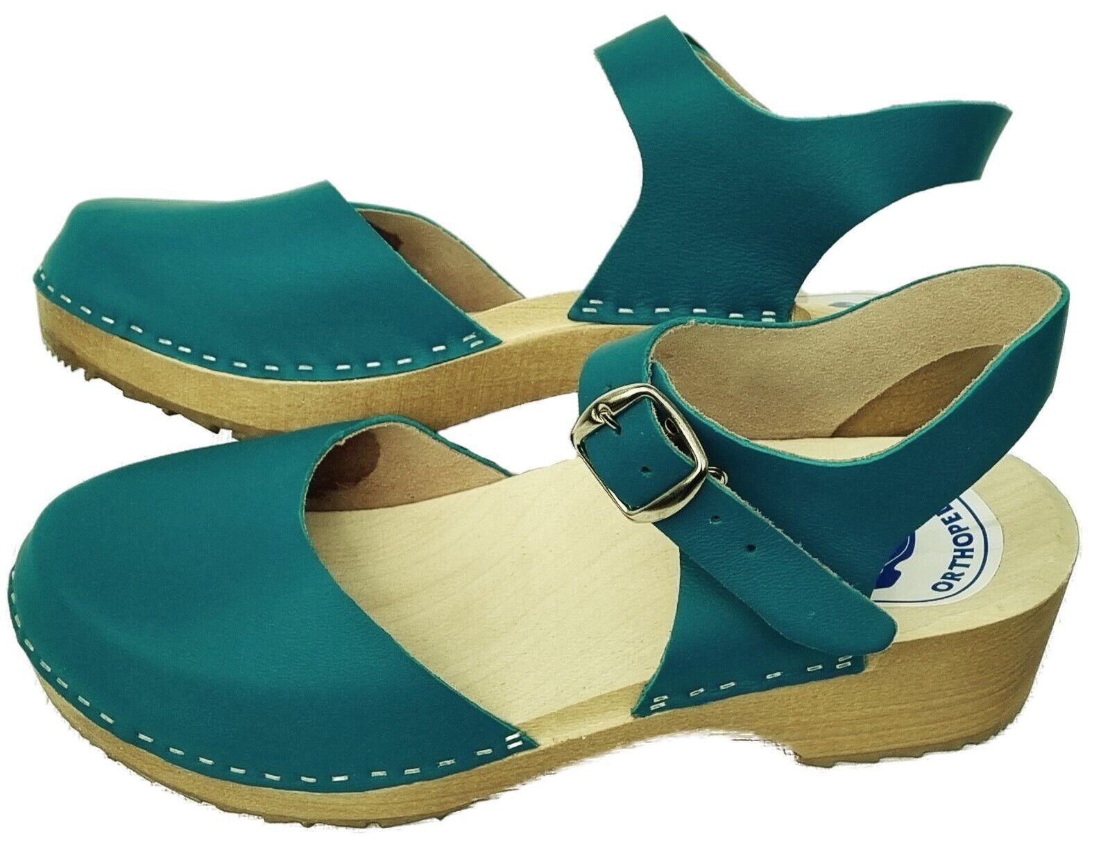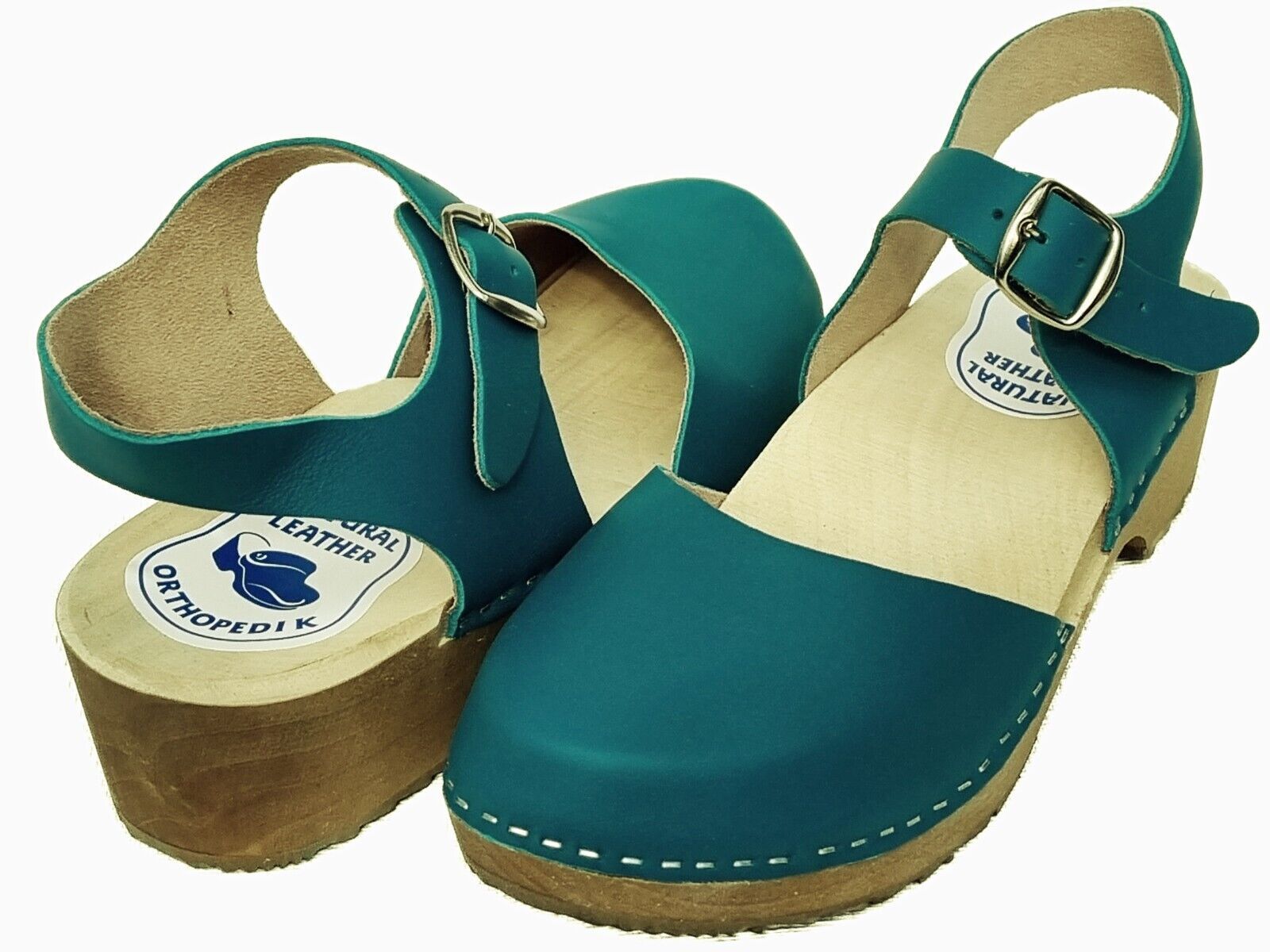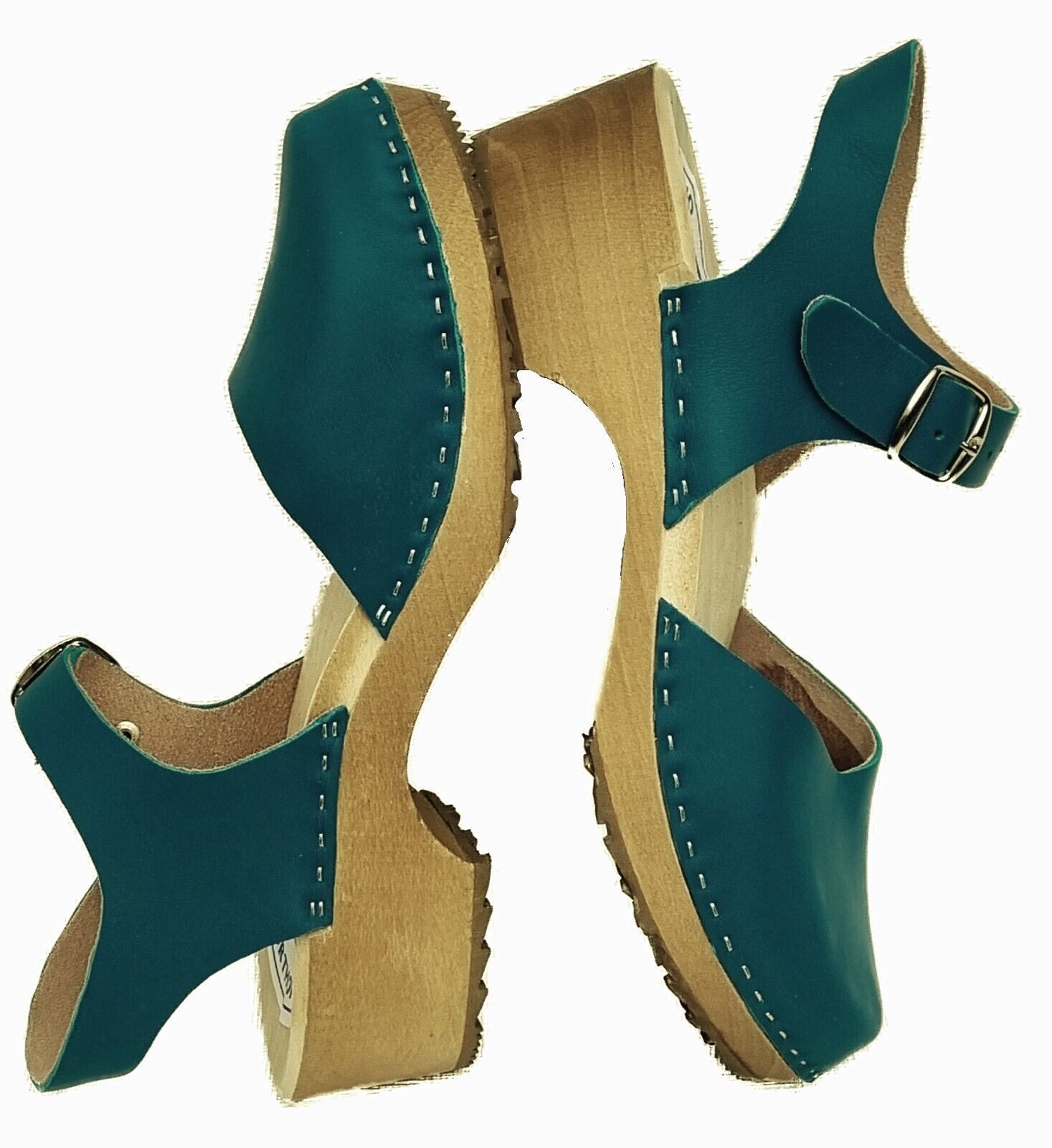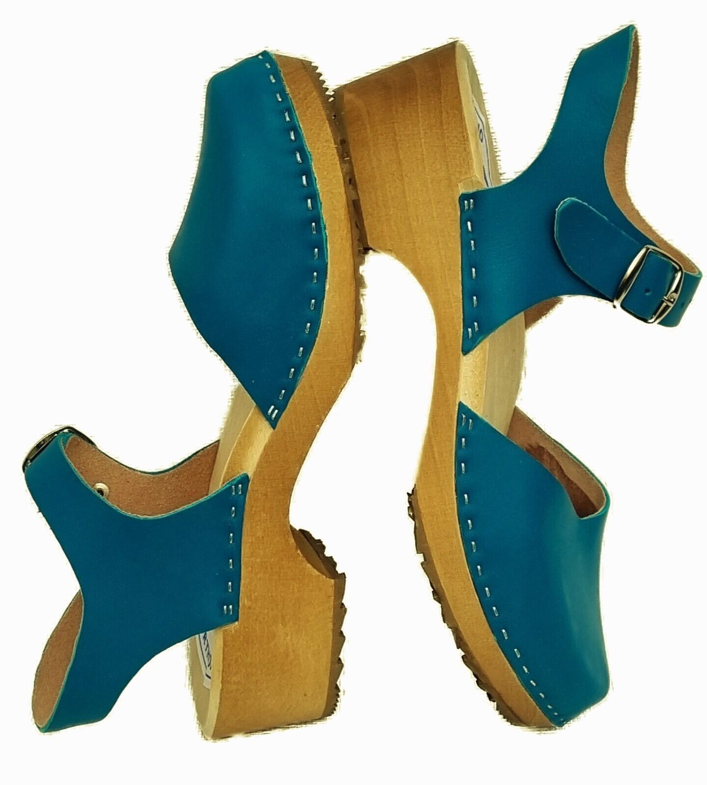 HOLZ CLOGS Pantolette Sandalen Gr.38 * Türkisblau* Echt Rind Leder Handgefertigt