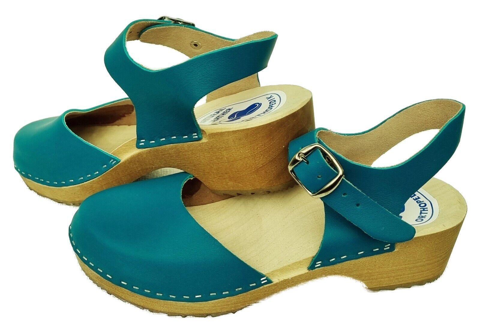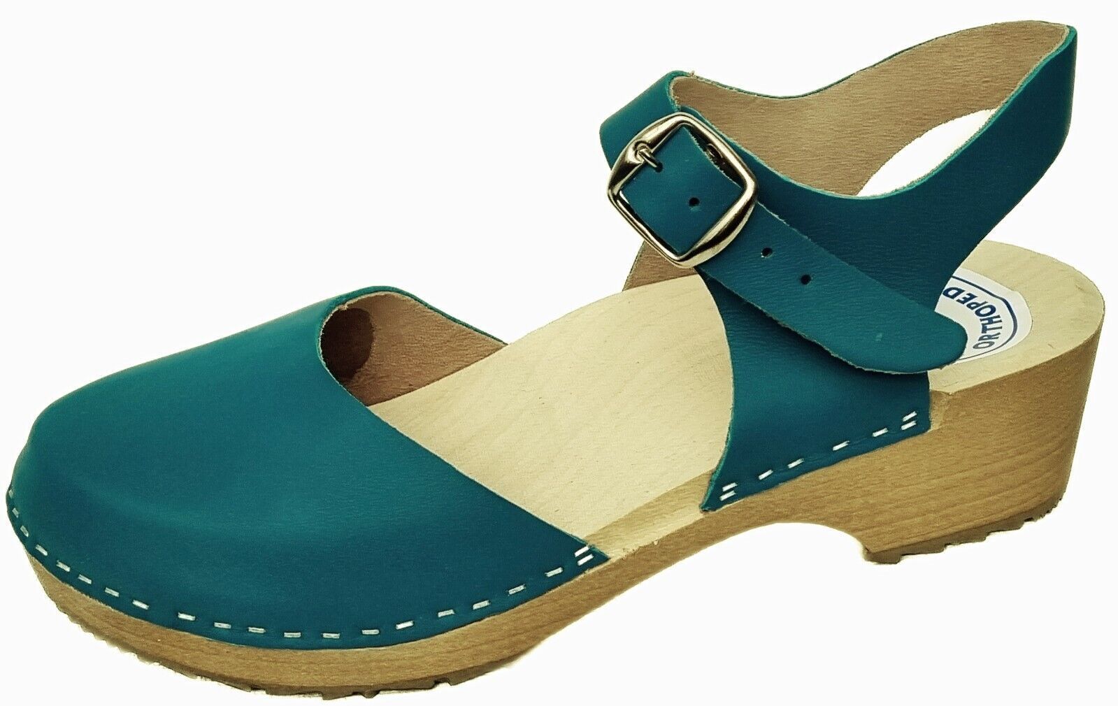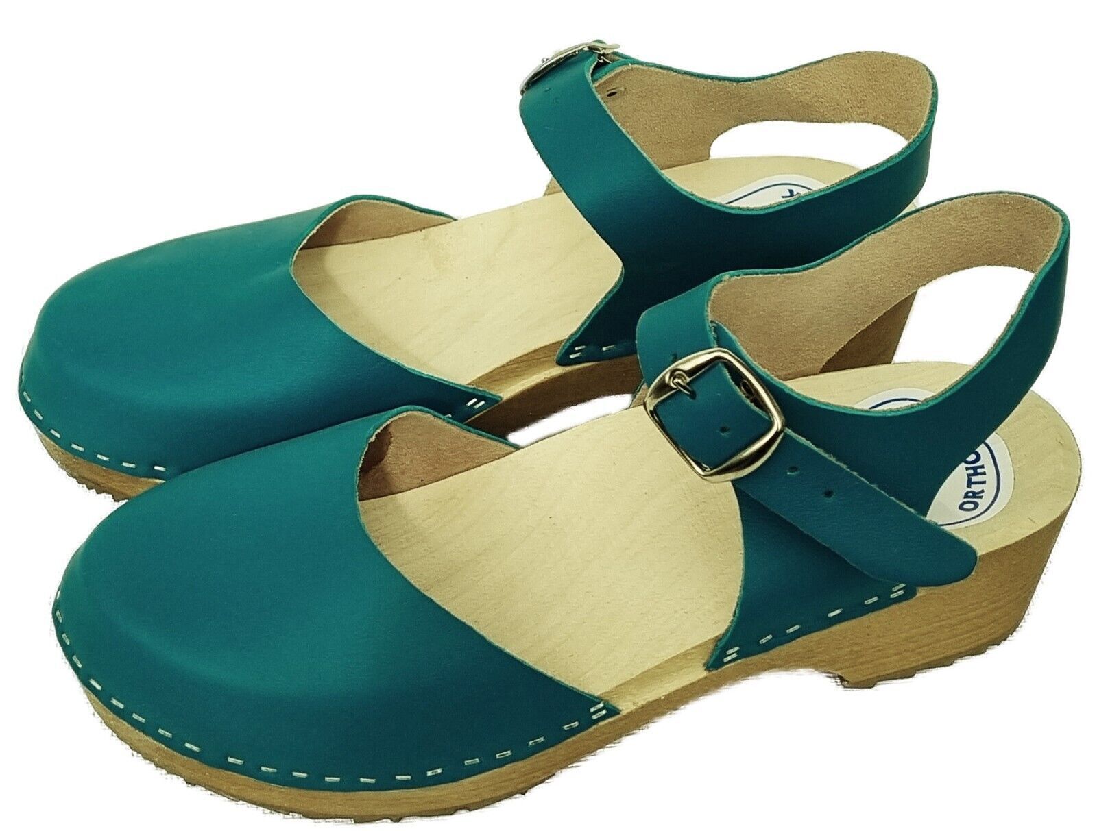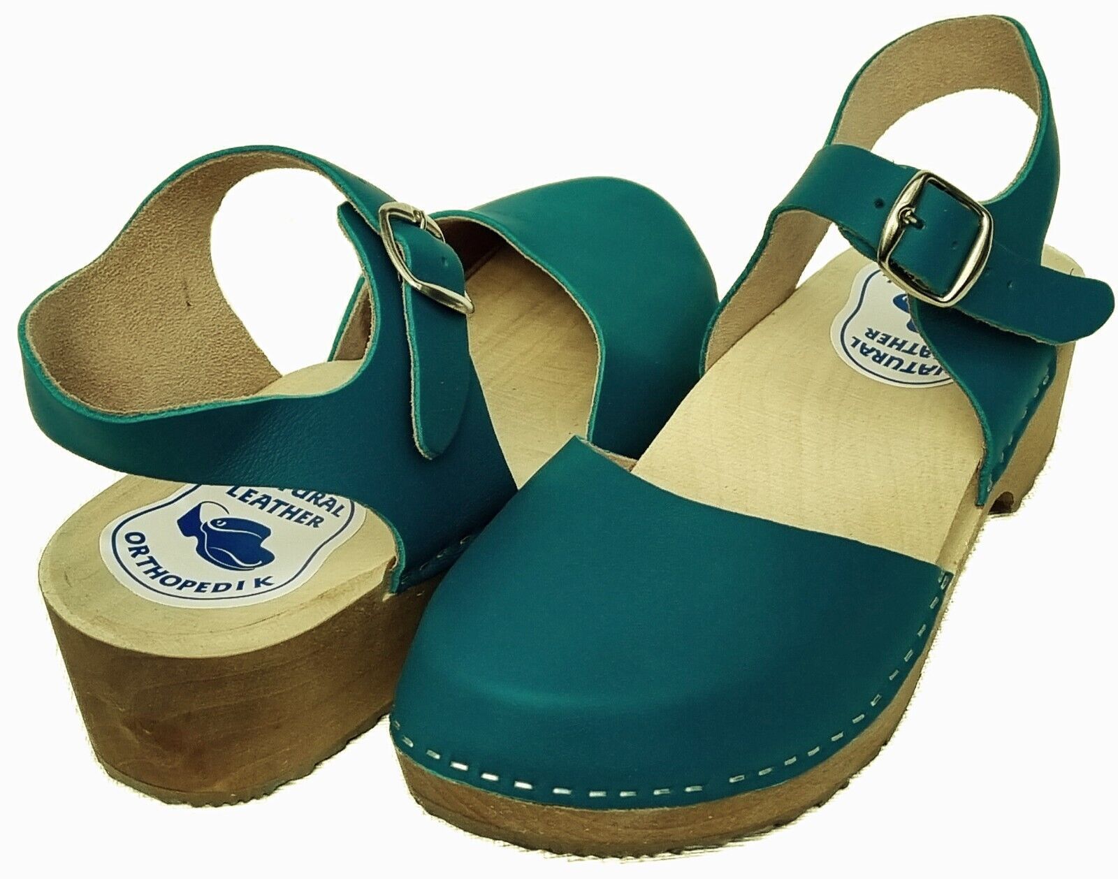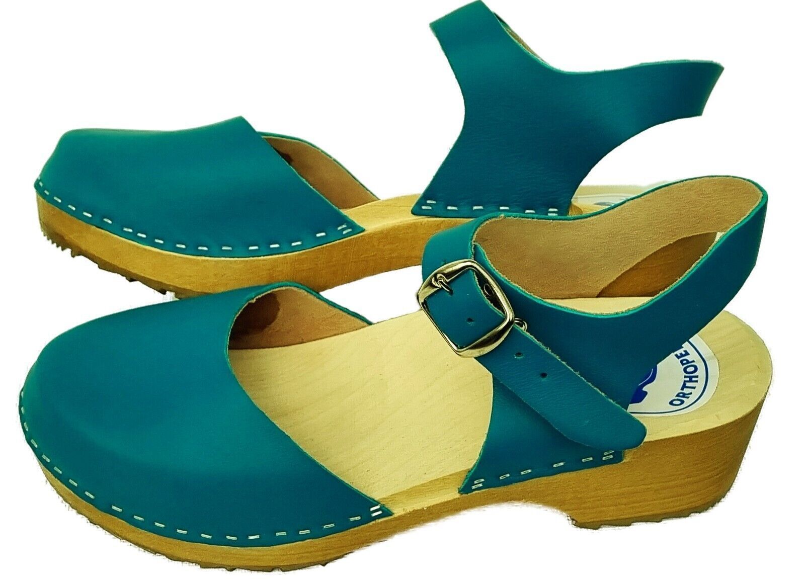 HOLZ CLOGS Pantolette Sandalen Gr.38 * Türkisblau* Echt Rind Leder Handgefertigt
