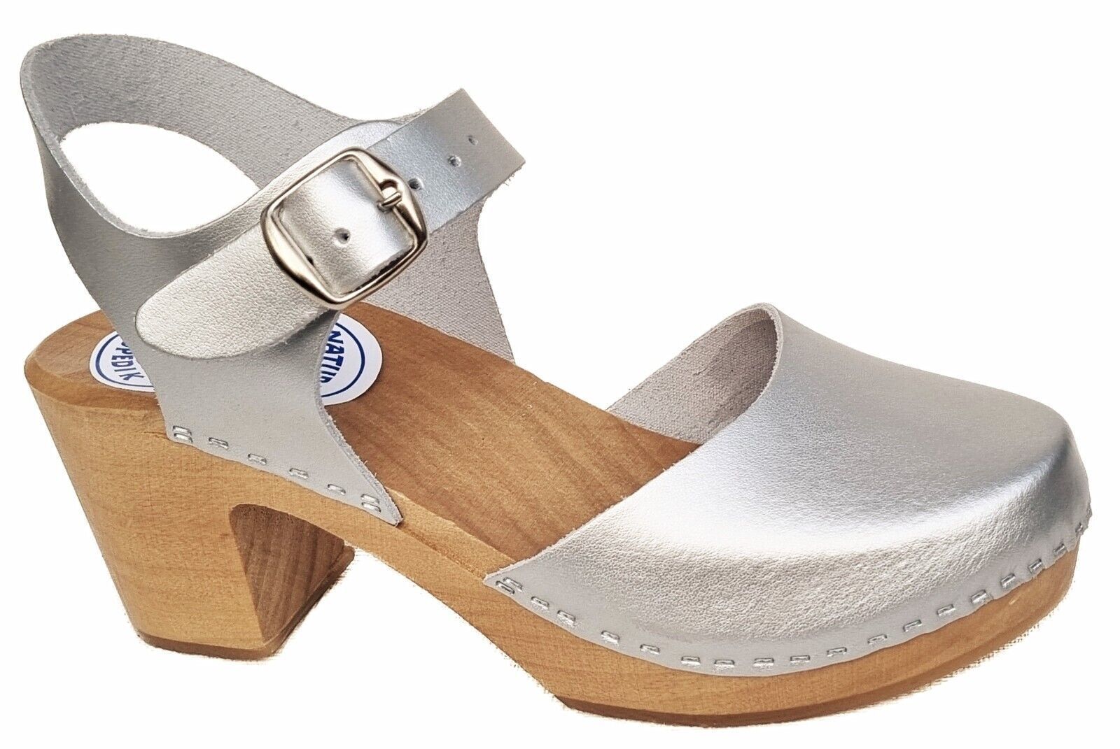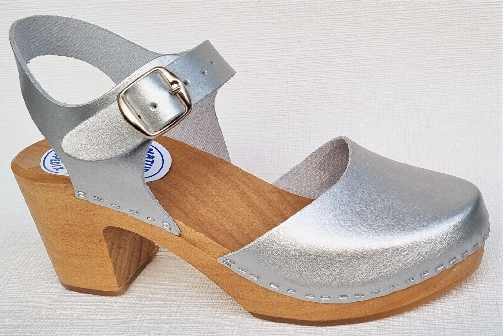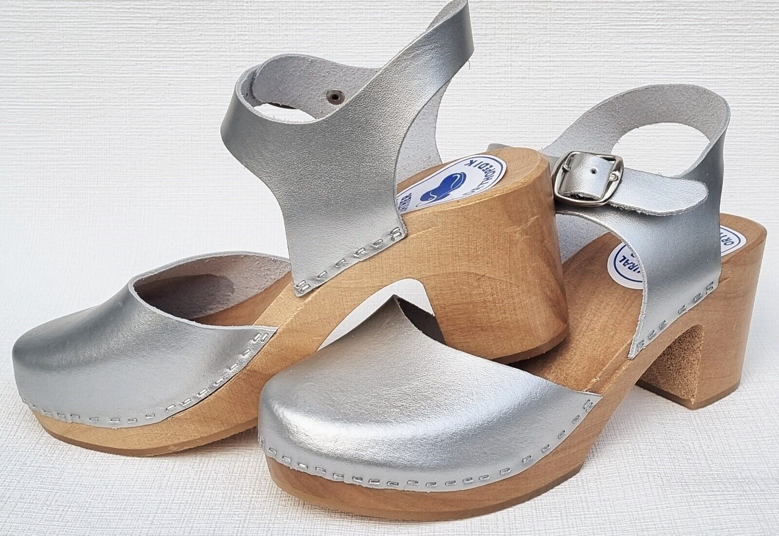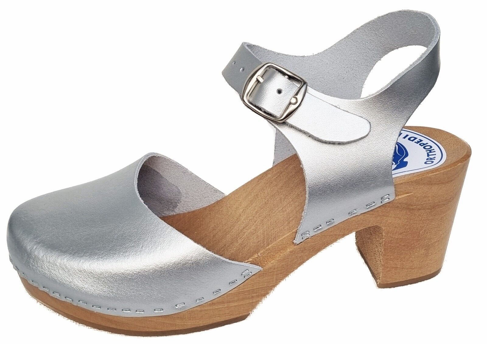 HOLZ(e)CLOGS Pantolette Sandalen Gr. 39 *SILBER* Gefertigt aus Holz; Obermaterial - Rind Leder Glattleder Die Sohle besteht aus grob profilierter Gummi (rutschfest) Absatzhöhe: 7.5 cm Holzsohlen - 2 cm dick Neu, stabile Ausführung Ein reines Naturprodukt **** Schuhbreite : Normal Die Sohlen sind gut