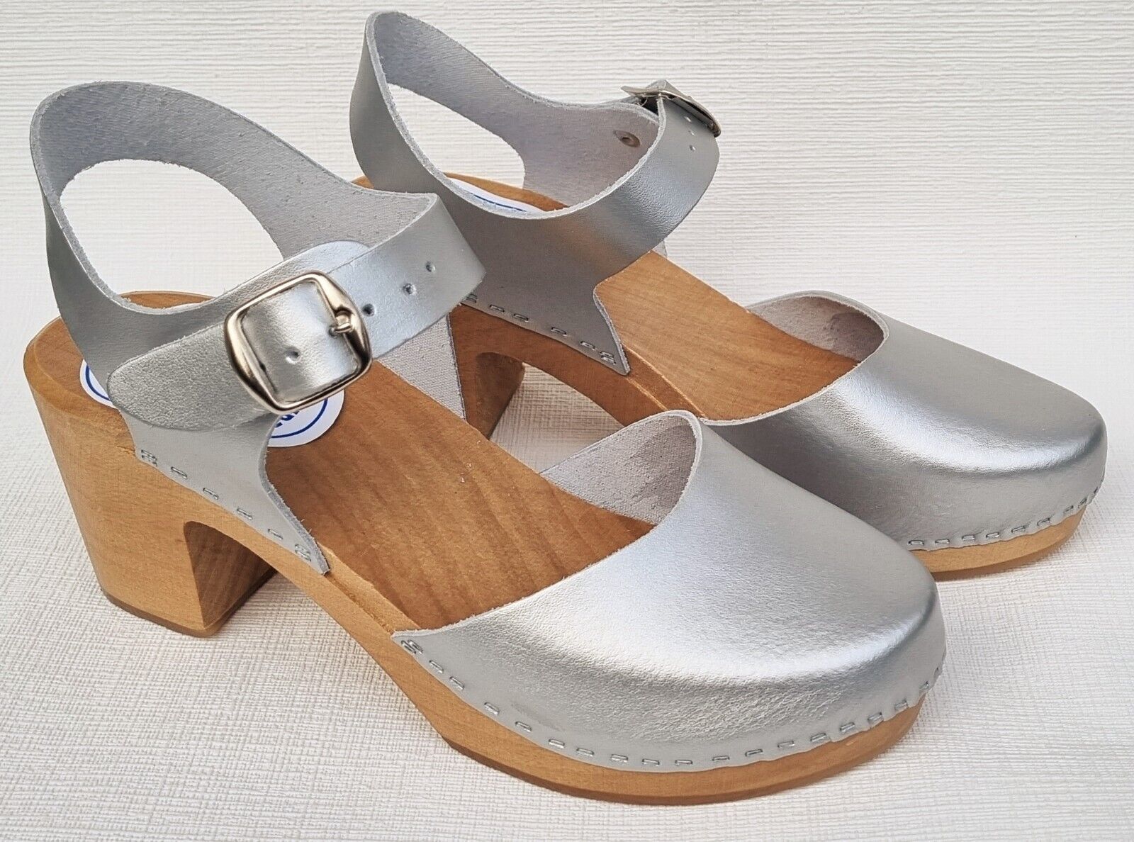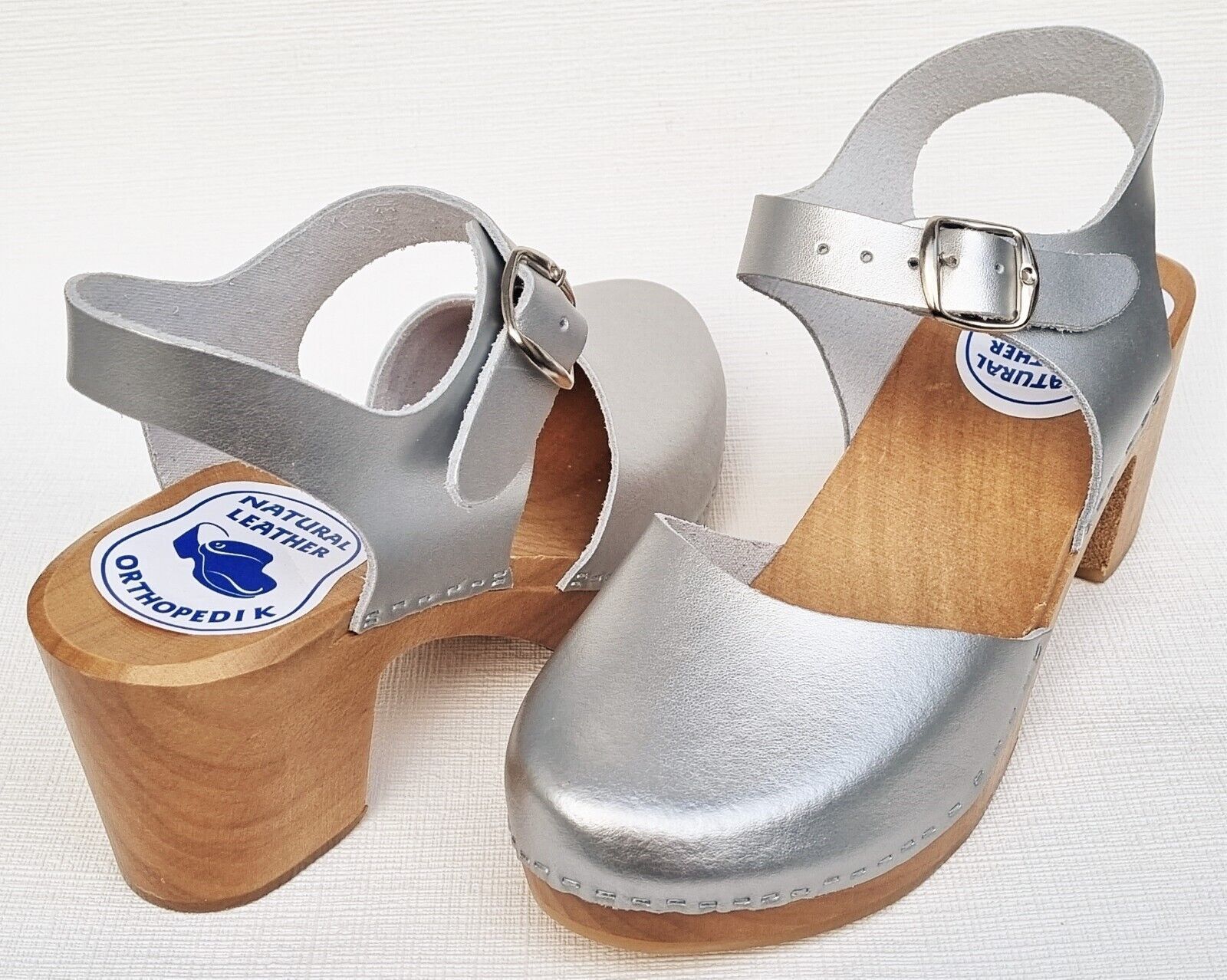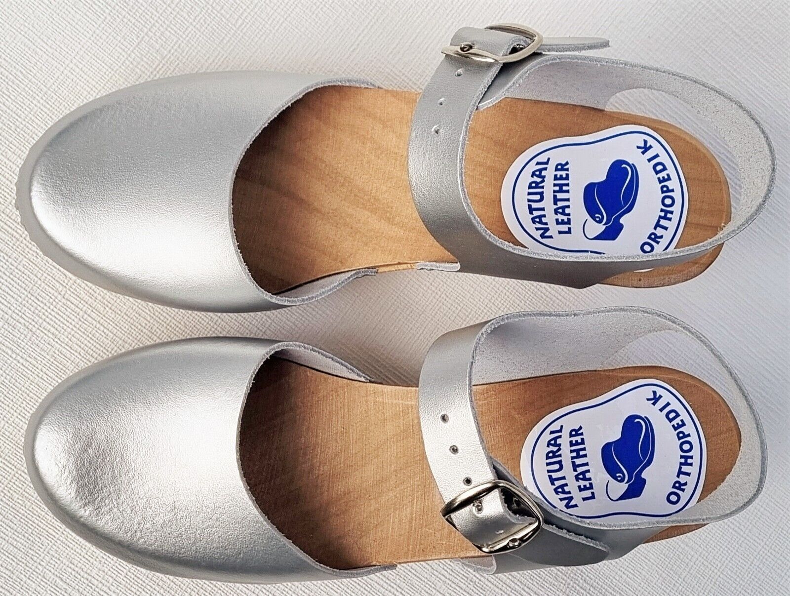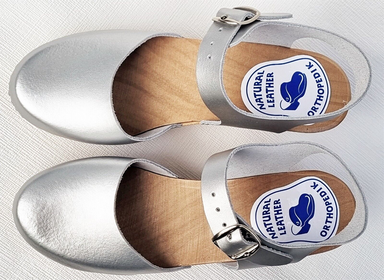 HOLZ CLOGS Pantolette Sandalen Gr.39 * SILBER* Echt Rind Leder Handgefertigt -14