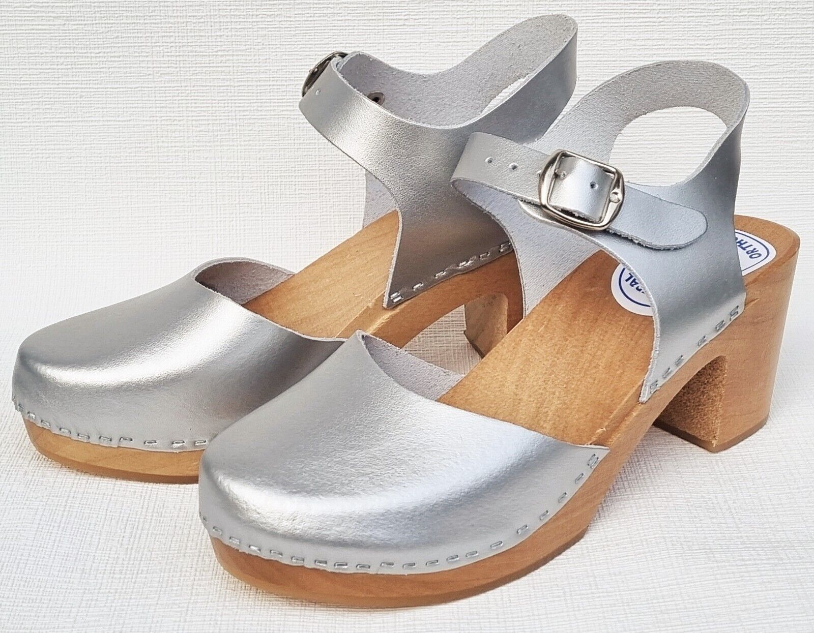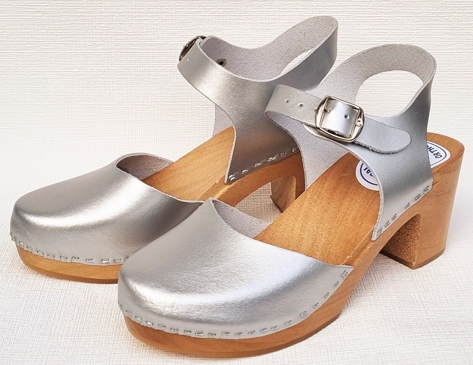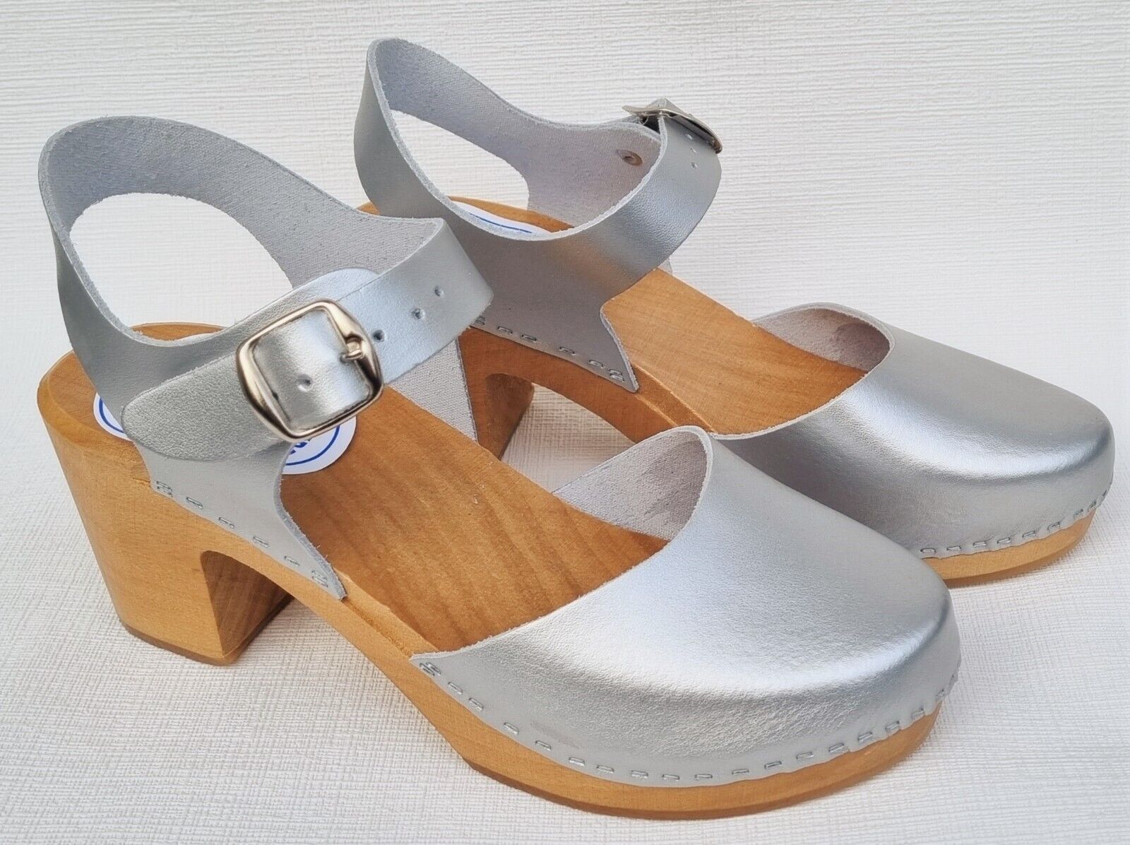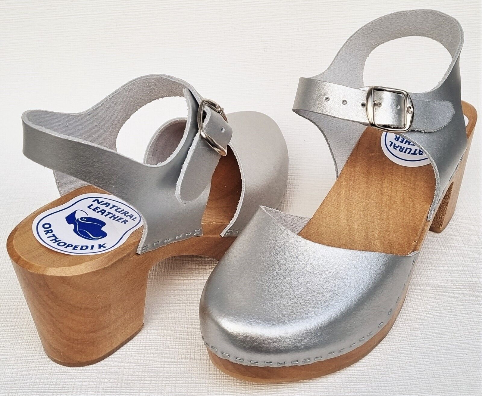 HOLZ CLOGS Pantolette Sandalen Gr.39 * SILBER* Echt Rind Leder Handgefertigt -14