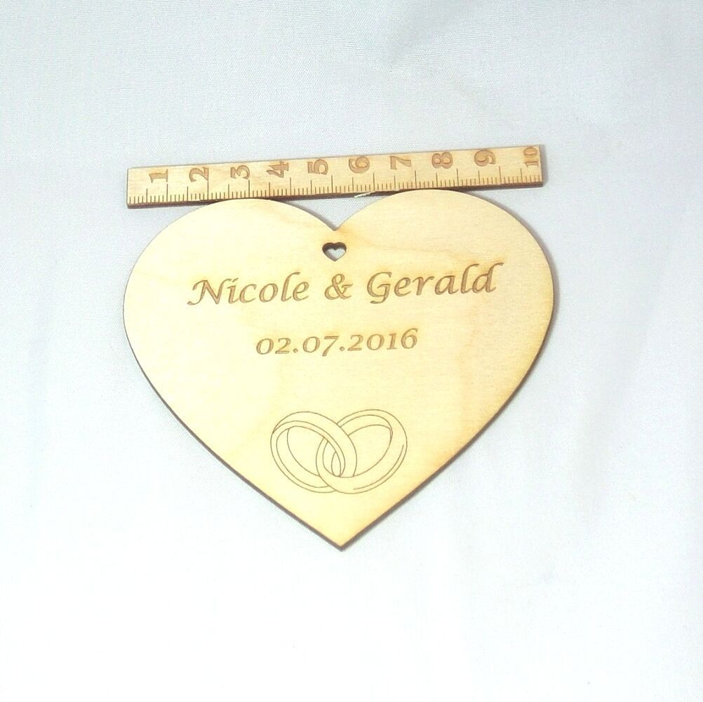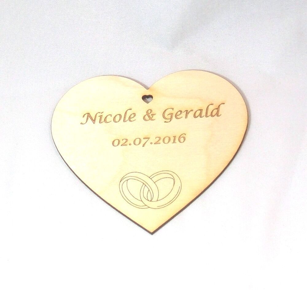 1 Graviertes Personalisiertes Herz mit Namen des Hochzeitspaares. Mit gravierten Eheringen und einem Loch in Herzform. Man kann dieses Tolle Herz auf Glückwunschkarten kleben, damit die Geschenke gestalten oder aber es einfach als Dekoraton auf den Tisch legen. Auch kann man Sie gut in das Blumenges
