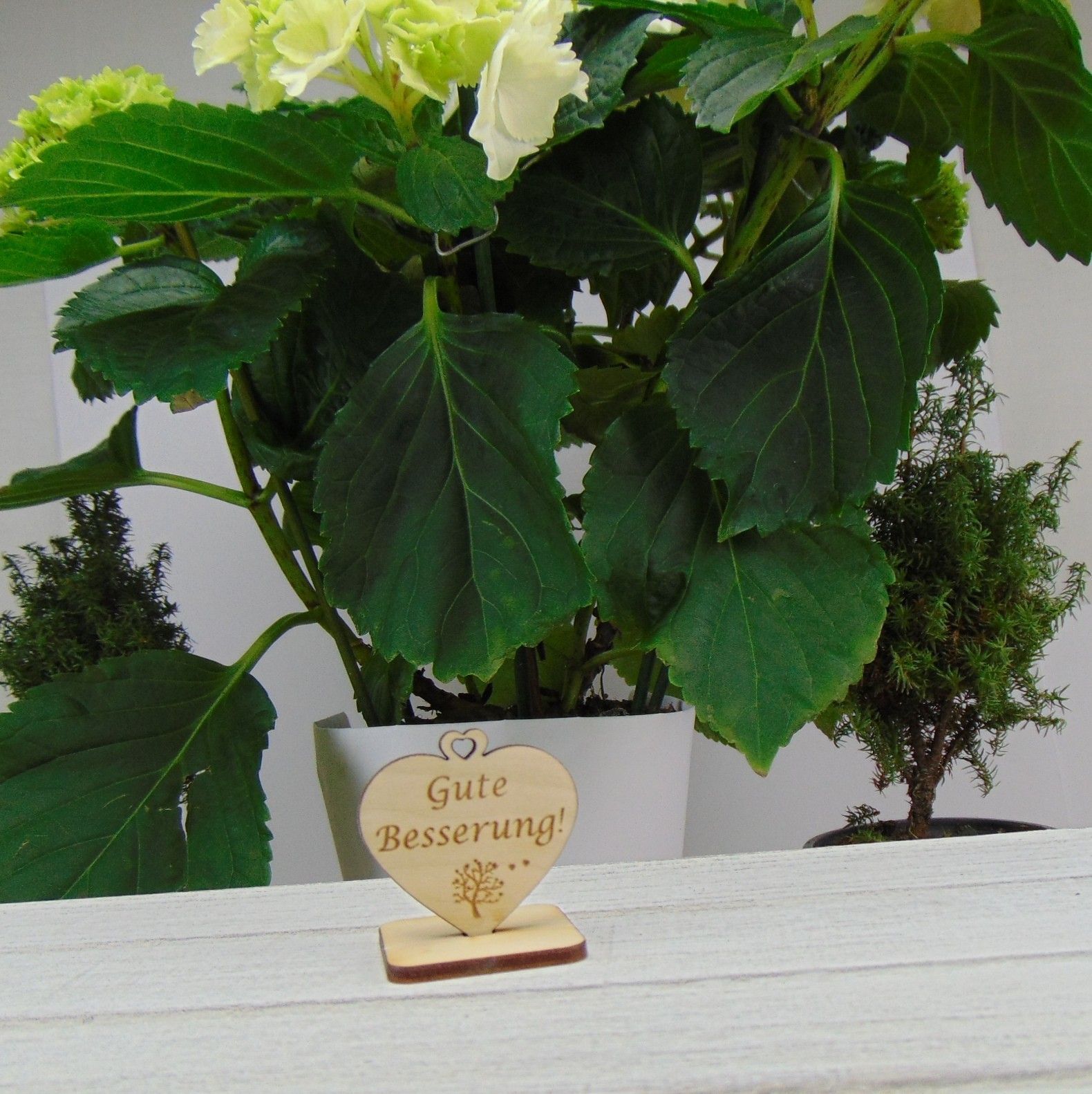 Ein stehendes Herz zum Hinstellen mit personalisierter Gravur aus 3 mm Birkenholz in einer Höhe und Breite von je 40 mm. Herzen aus Holz mit der Aufschrift " Gute Besserung " Die Tischdeko Herzen liefern wir mit einer Unterplatte in der Größe ca 40 mal 40 mm zum Hinstellen, Sie erhalten insgesamt 2 Teile, die zusammengesteckt und für eine Langlebigkeit geklebt werden können.