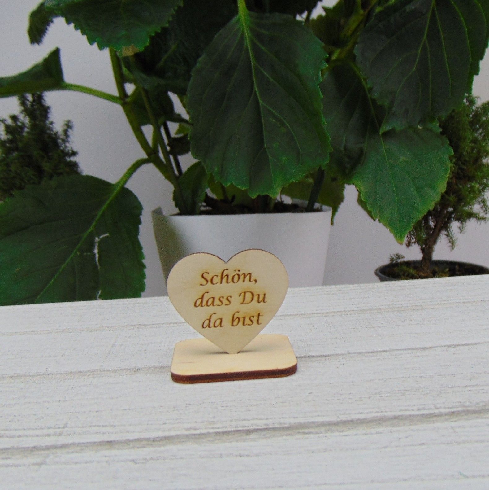 Holz Herzen graviert mit Fuß " Schön das du da bist " stehend 4 x 4 cm